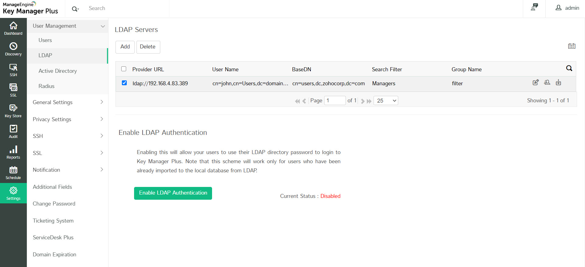 Integrate Key Manager Plus with the LDAP servers in your environment. Through the LDAP integration, you can import AD users from Microsoft Active Directory and OpenLDAP into Key Manager Plus Linux installations and the user database can be regularly updated through the sync operation provided in the UI. In addition, users can leverage the LDAP authentication for access, bypassing the local authentication provided by Key Manager Plus. Currently supported LDAP server types are Microsoft Active Directory and OpenLDAP. This LDAP integration works with both Windows and Linux installations of Key Manager Plus, however, it's more beneficial for users with Linux installations as it helps them import Microsoft AD users in their environment, in the absence of the Active Directory import option which works only in Windows installations of Key Manager Plus. This section explains the configurations involved in integrating LDAP server with Key Manager Plus.