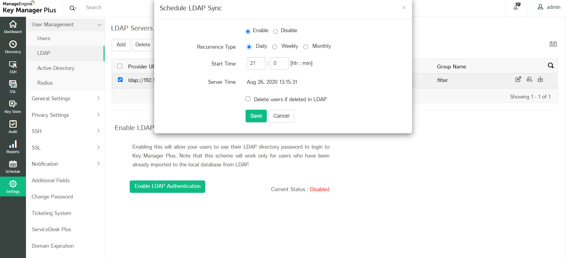 - Check the Delete users if deleted in LDAP option to remove deleted LDAP users from Key Manager Plus during the sync operation. Click Save to save the LDAP Sync schedule.