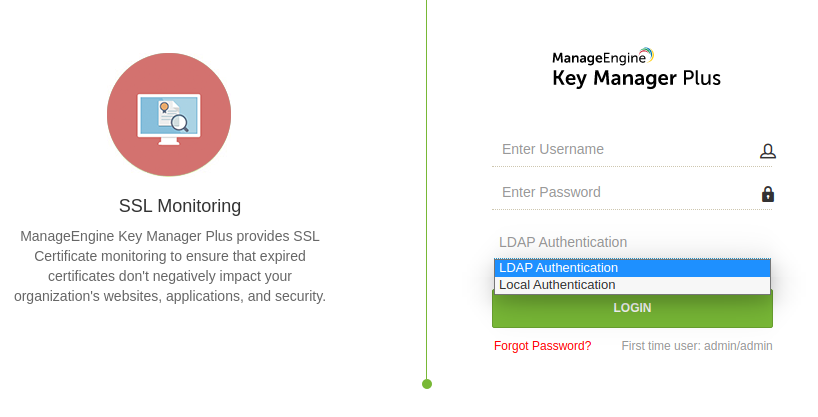 Once LDAP users are added to Key Manager Plus, they can user their LDAP credentials to leverage access to Key Manager Plus. Choose the LDAP Authentication option at the login page, provide your LDAP credentials and click login.
