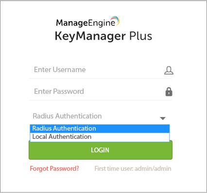 Also, KMP provides an option for the RADIUS users to login independently using the local authentication option provided. With local authentication, users should specify user credentials provided to them by administrators. Users can choose between the two authentication at the time of login as shown below: