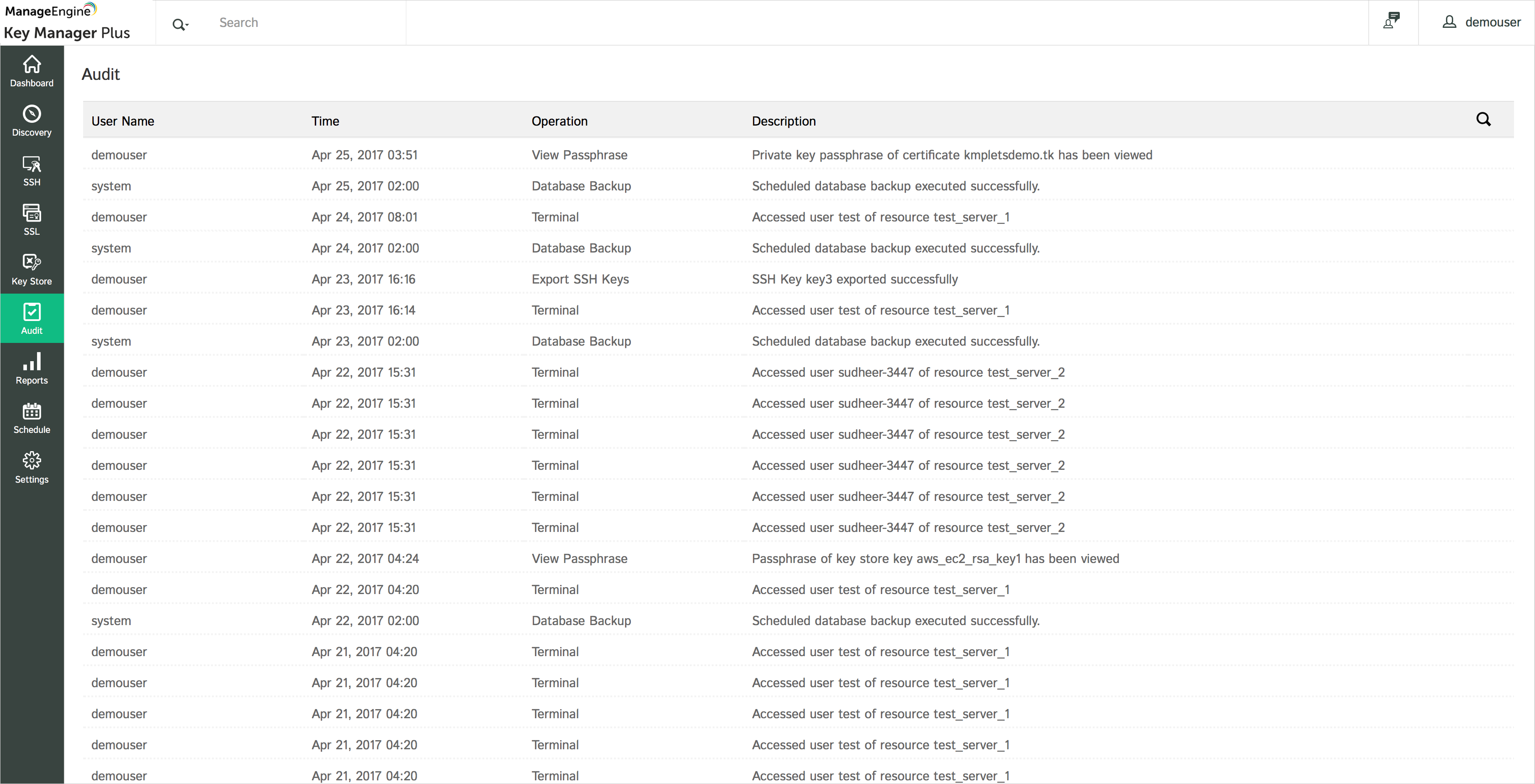 Key Manager Plus comes with an efficient auditing mechanism, which records all activities performed in the product. The audit trails capture information on 'who' performed 'what' operation and 'when'. Only the administrators in Key Manager Plus can view the audit records pertaining to all users. The operators can only view the records pertaining to them.