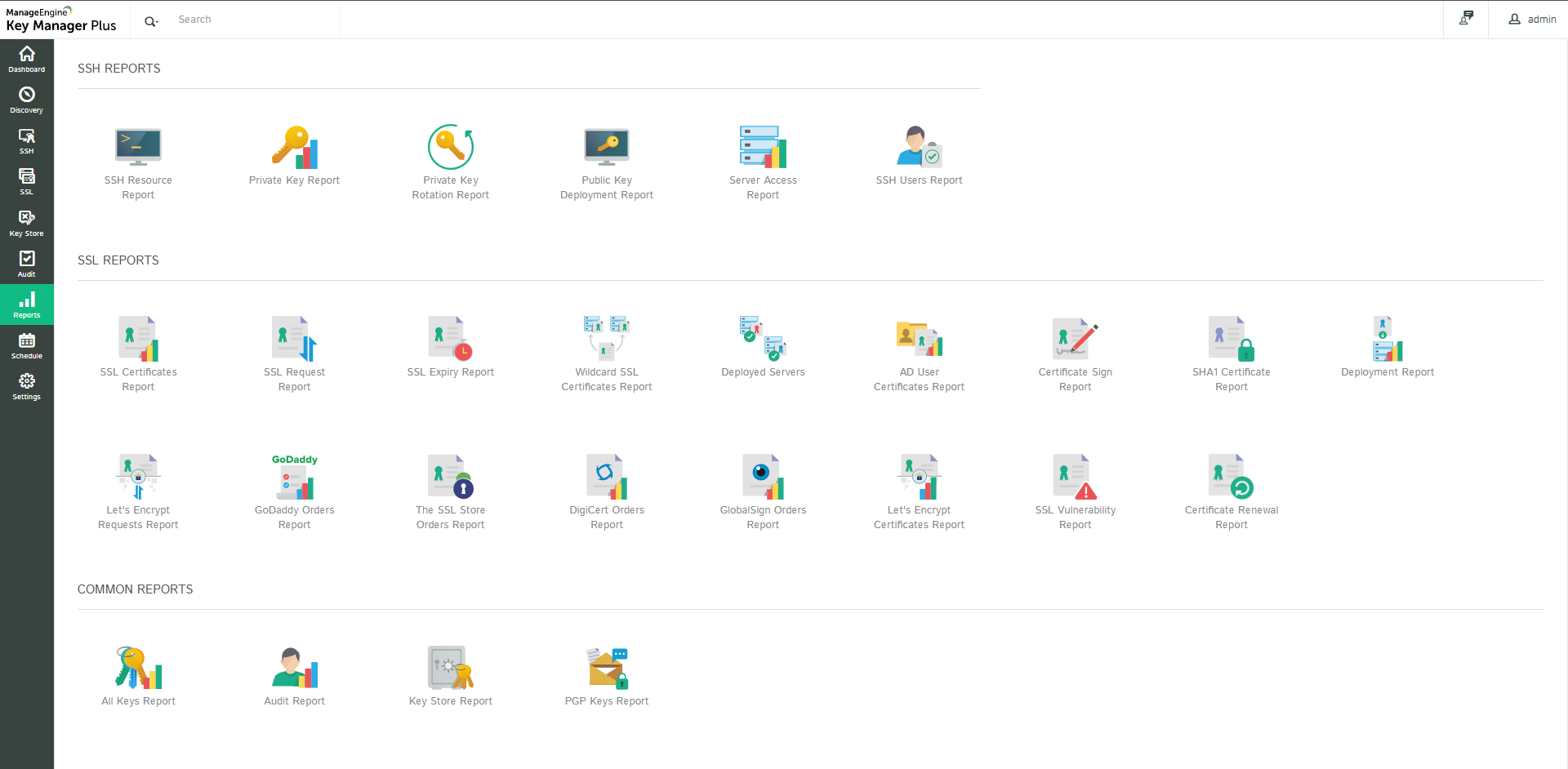 You can view the reports from the Reports tab in the GUI. Key Manager Plus provides the following reports: