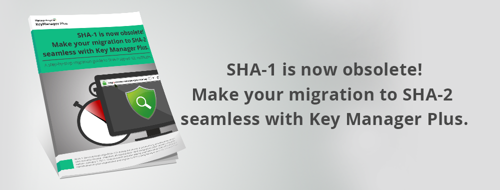 SHA-1 (Secure Hash Algorithm 1) is simply not secure. It can lead to system downtime, errors, and security threats. Therefore, all organizations need to migrate to SHA-2 signed certificates before January 1, 2017. This document provides step-by-step instructions to identify all SHA-1 certificates in your organization and migrate to SHA-2 using ManageEngine Key Manager Plus.
