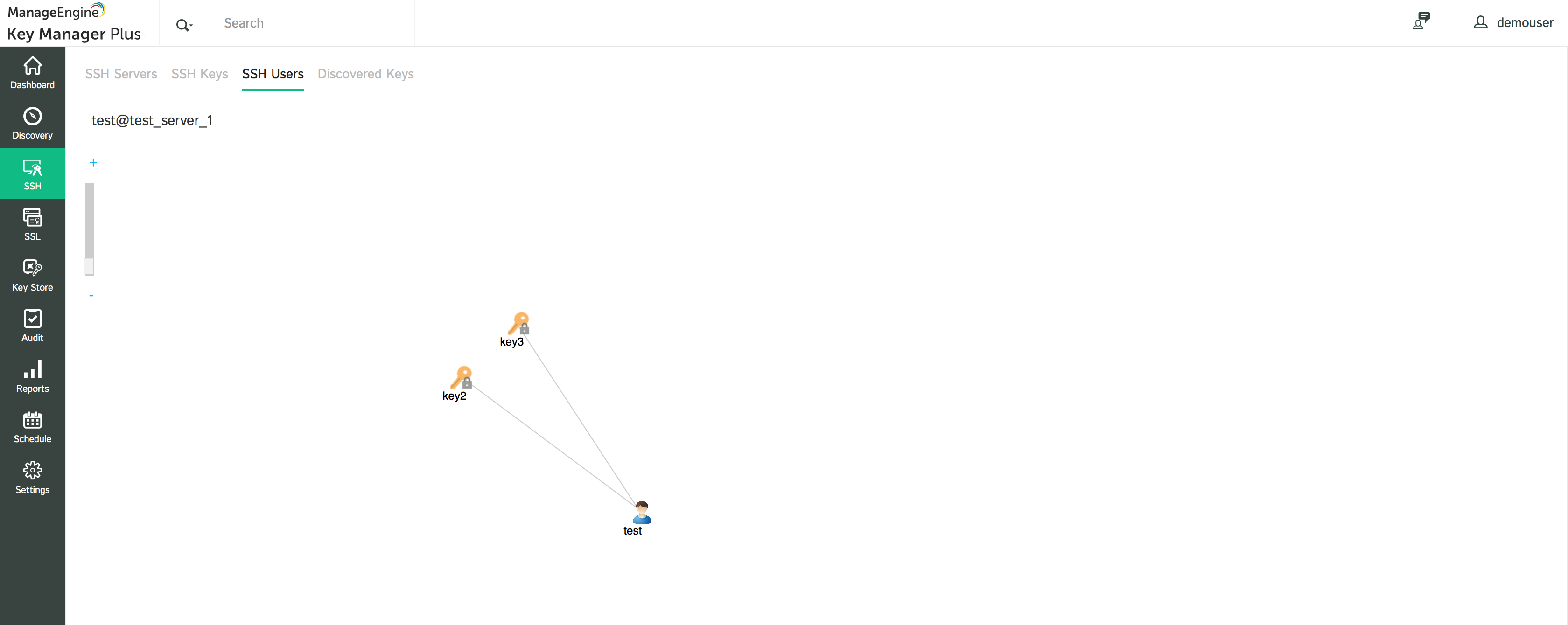 Key Manager Plus 可帮助您管理密钥,即,它不仅获取和存储密钥,而且还会给出机构中的密钥/用户关系的完整视图。它将各个密钥映射至远程服务器中的相应用户帐户。此过程使得在用户取消配置期间更容易识别和删除与用户相关联的密钥对。而且,管理员可查看和删除网络中可用的未使用密钥。