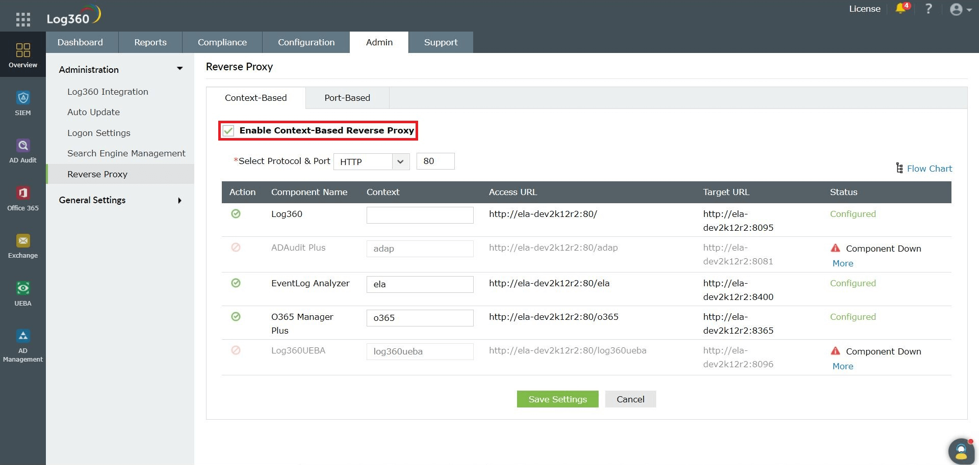 Log360允许您启用基于上下文的反向代理和/或基于端口的反向代理。