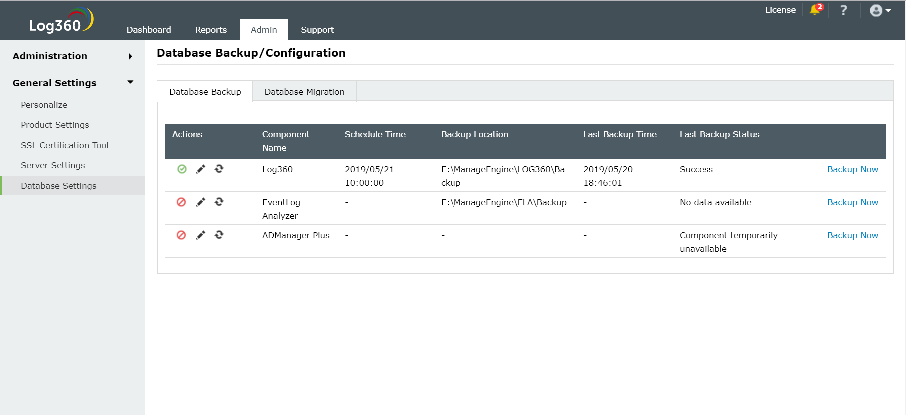 Log360可以根据您的计划,定期自动备份数据库和集成产品中使用的数据库。使用这个选项,您可以备份产品中内置的PostgreSQL数据库或外部的PostgreSQL和MS SQL数据库。