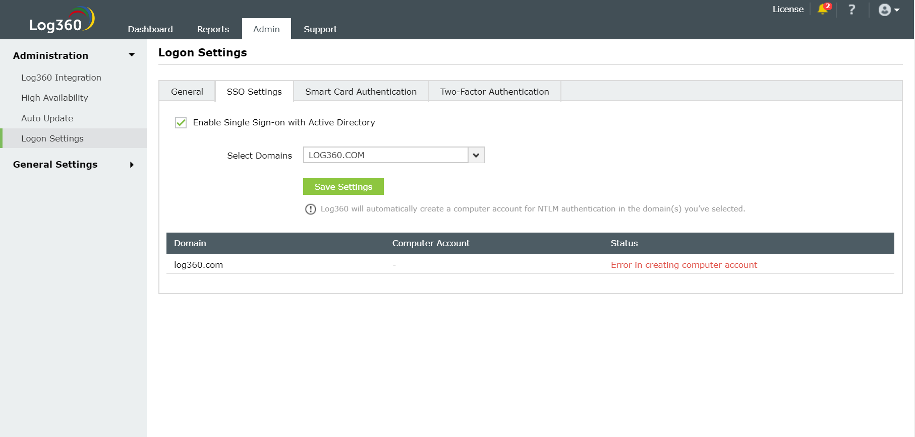 本部分允许配置单一登录,这将允许已通过其Windows域进行身份验证的用户将自动登录到Log360。