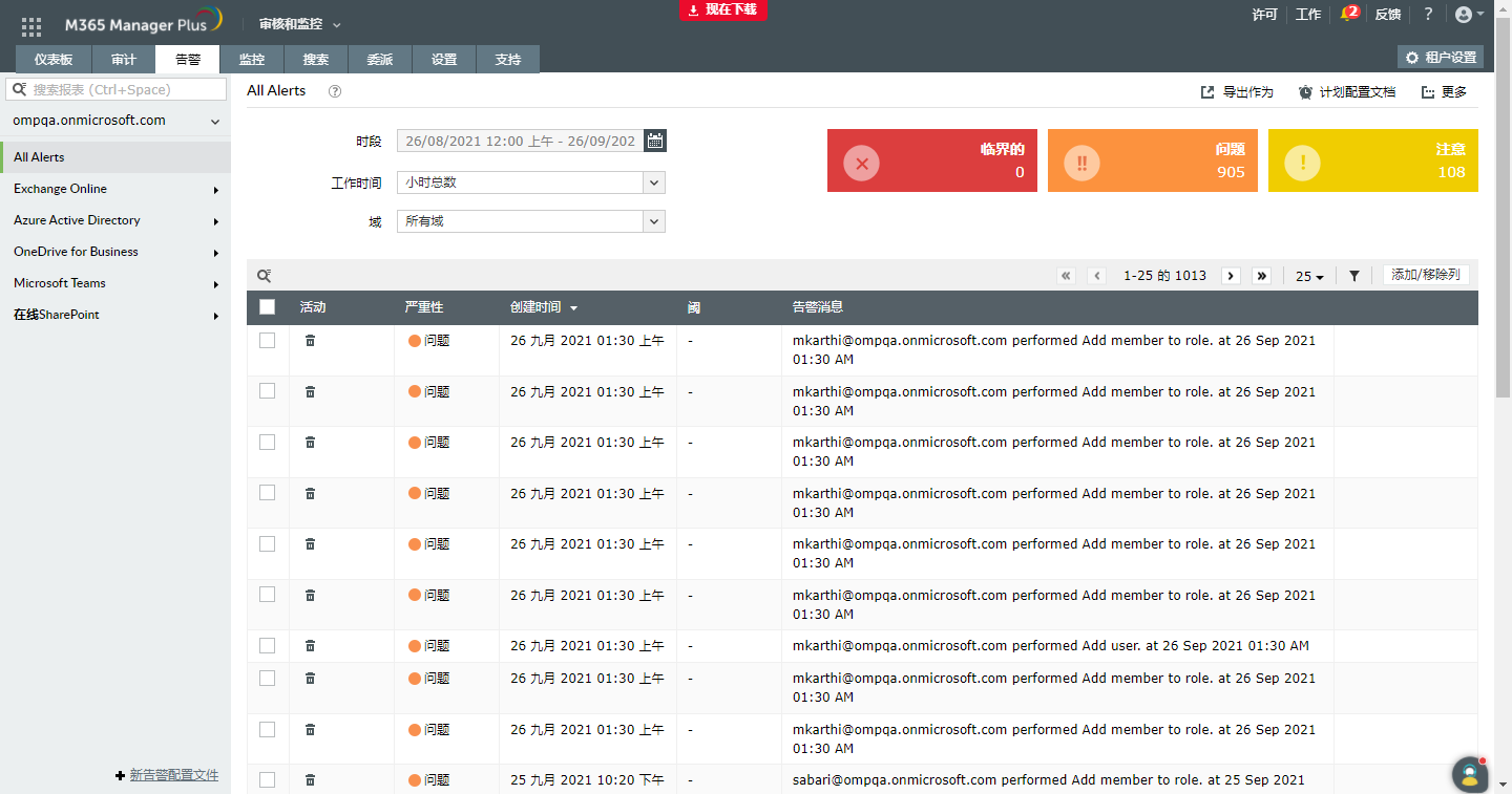 当Microsoft365环境中发生关键活动和更改时,Log360可以设置相应的告警配置文件。当您需要查看某个用户的详细活动时,您可以创建自定义报表和告警活动。