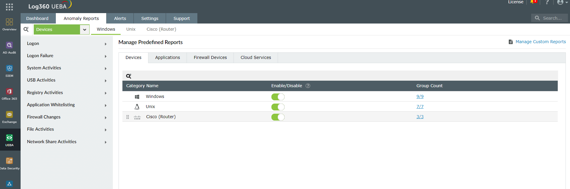 可以使用报告视图中的切换按钮启用或禁用所有格式的类别、组和报告。单击切换按钮将启用或禁用类别、组或报告。它也不会显示在报告选项卡中。UEBA 组件的日志收集和异常检测仅针对启用的部分进行。