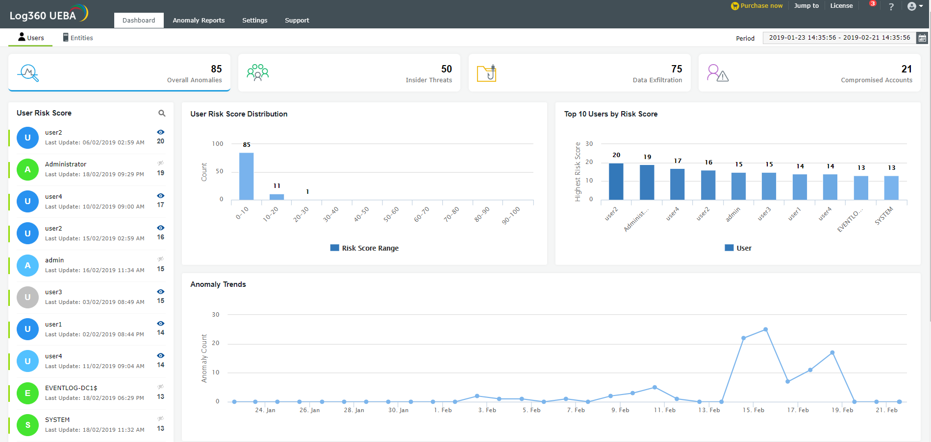 一个大型组织可能面临几个内部威胁,一些非常轻微,另一些则更危险。Log360的UEBA仪表板具有基于分数的风险评估,可帮助您确定威胁的优先级,并确定哪些事件实际值得调查。