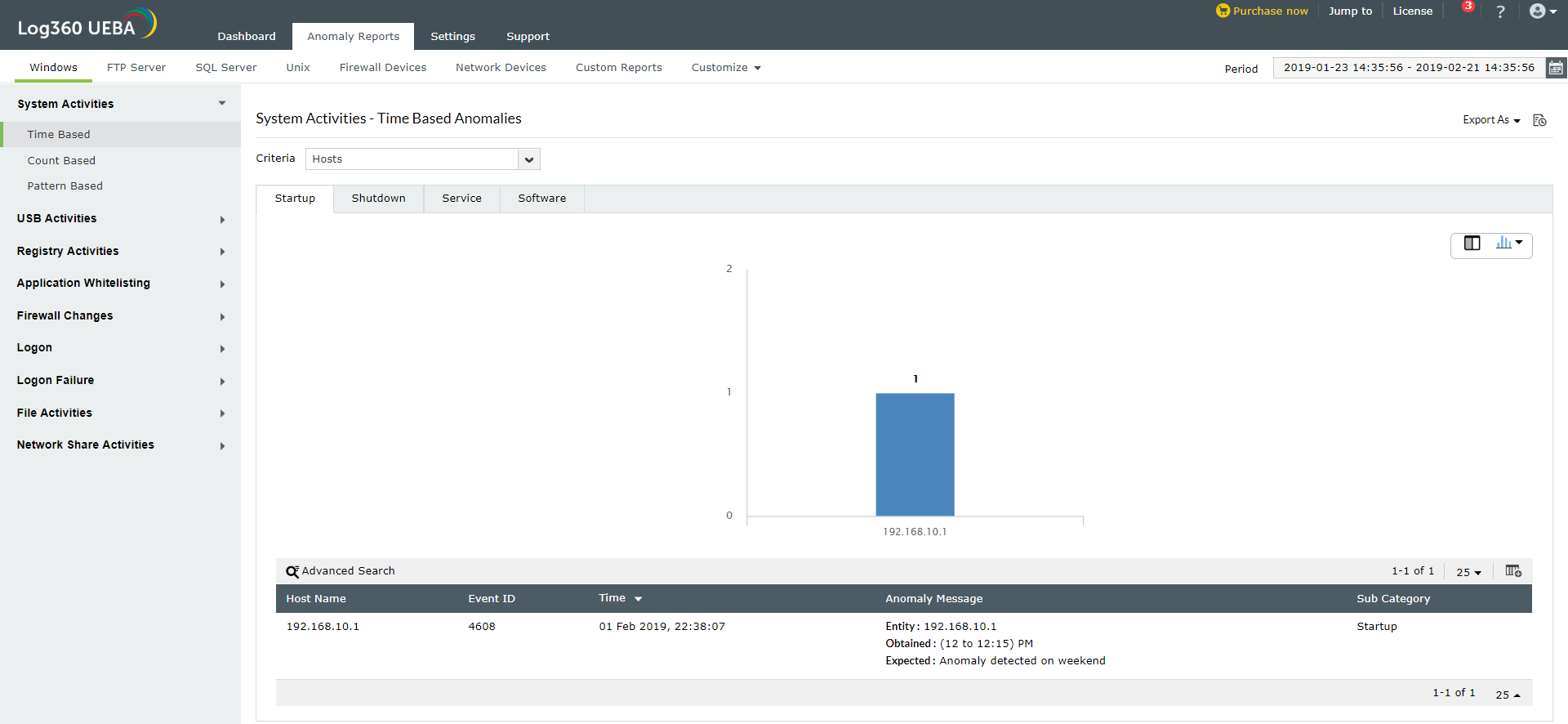 根据时间,模式和计数识别主机的异常行为。Log360 UEBA能够在以下位置发现异常实体行为: