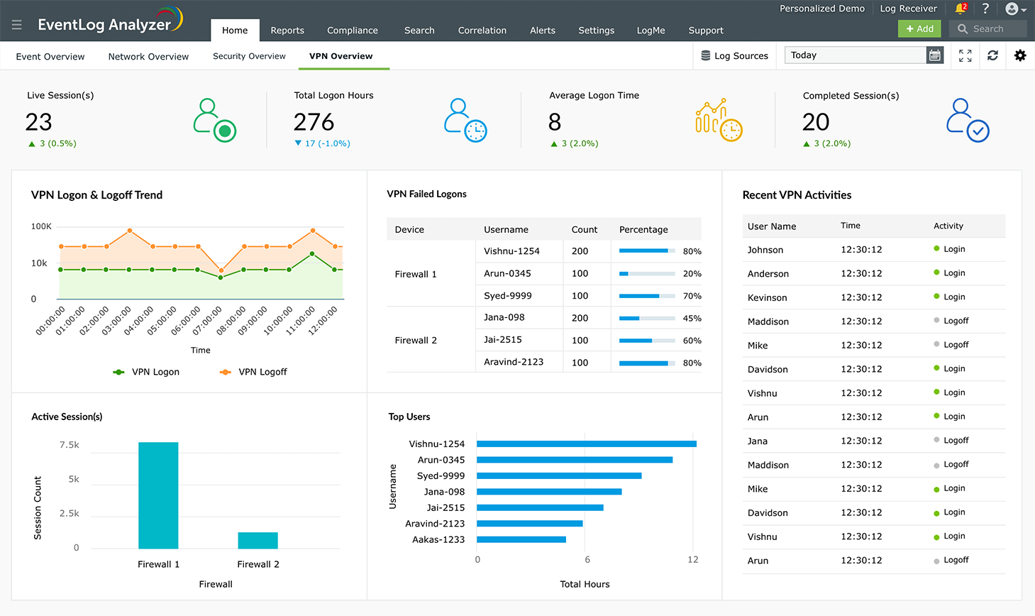 Log360提供了一个概述仪表板和一组内置报告。这些可以帮助安全管理员不断监控网络中的变化,并即时访问有关VPN安全的关键信息,包括:
