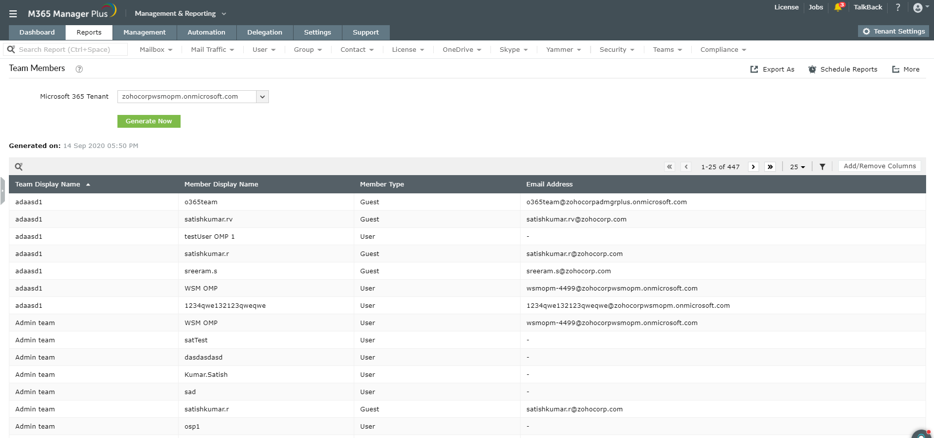 M365 Manager Plus offers comprehensive reports that help gain insights on the different facets of Microsoft Teams in a few easy clicks. The results can be filtered to display only the required information.