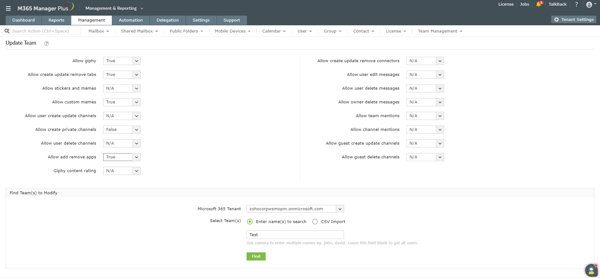 Updating Microsoft Teams in bulk using M365 Manager Plus: