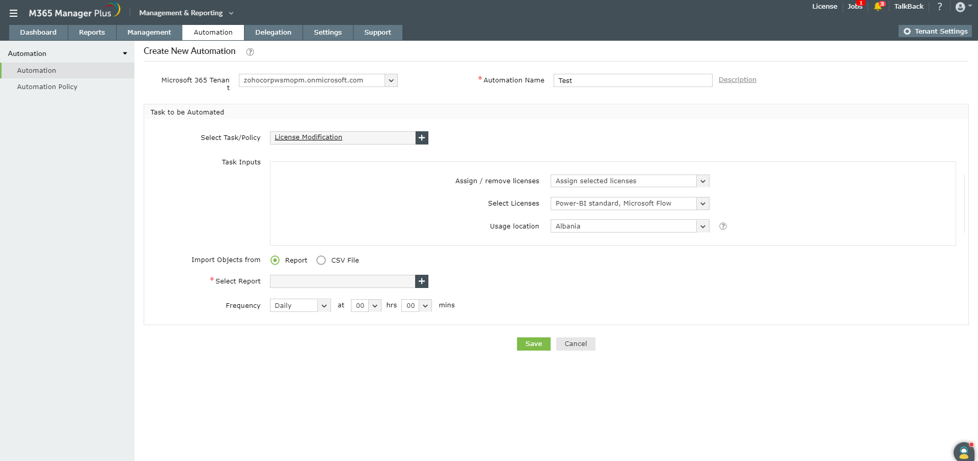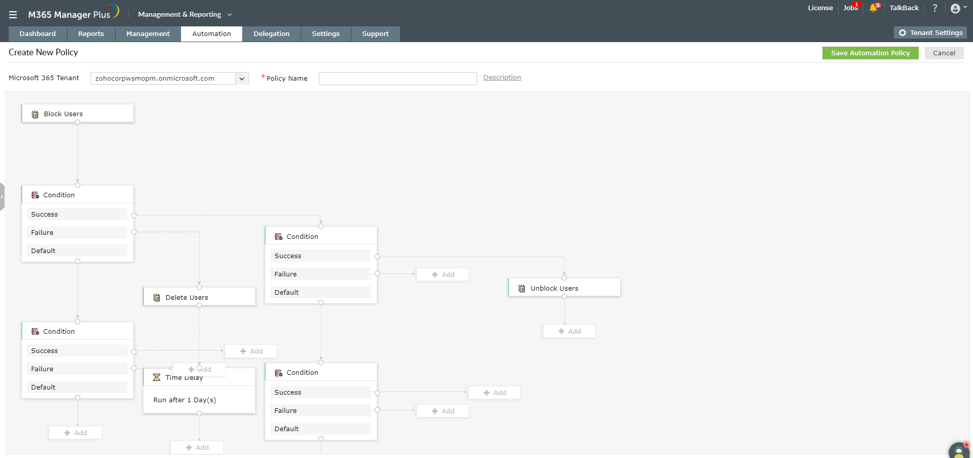 Automation policies: Using automation policies you can automate multiple user management tasks simultaneously. M365 Manager Plus offers automation for the user provisioning tasks such as: blocking/unblocking users, license modification, creation of users with/without license, role assignments, deleting users, restoring users and so on.