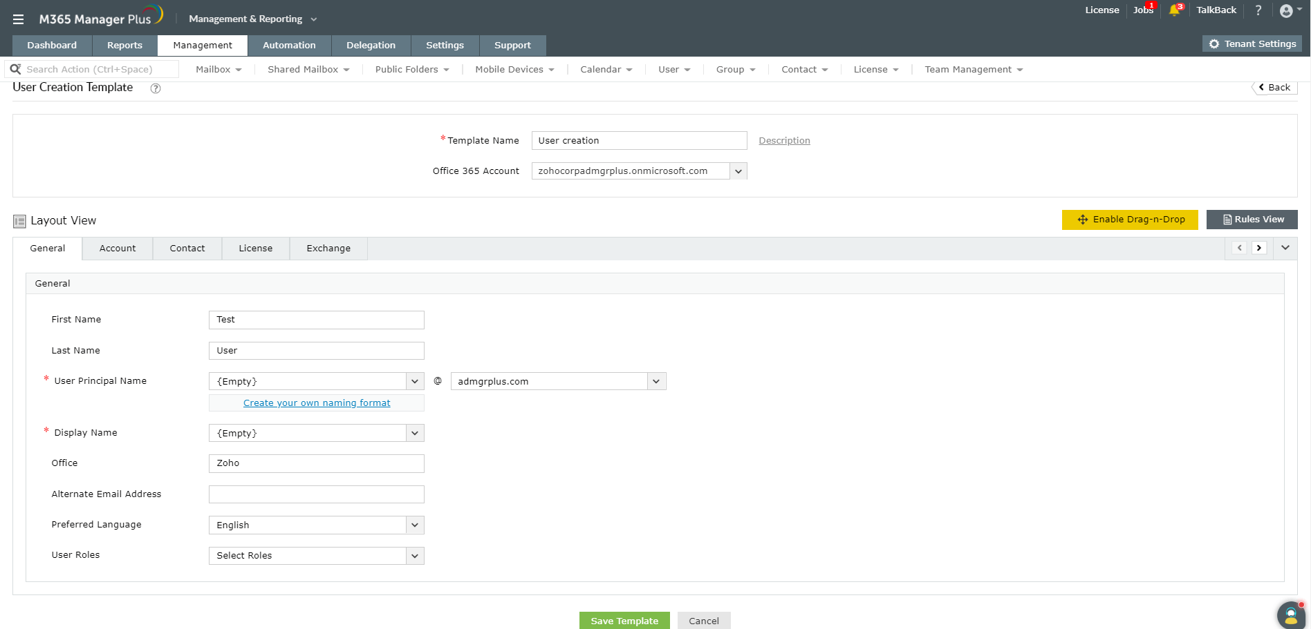 You can create customised user management templates using the Enable Drag-n-Drop option available under Management tab → User → User templates → User Creation Templates. Using this option you can add more fields or modify the existing ones in the deafult template. You can rename, edit, make the field mandatory or read-only, delete the fields, or make them silently active (this option does not allow the technician to edit the field while adding the user). You can also delegate user roles. Using the template's layout you can decide upon what fields should be featured while setting account passwords updating or creating contact details, license delegation and during Exchange mailbox creation for the user. This template simplifies and speeds up the automation process.
