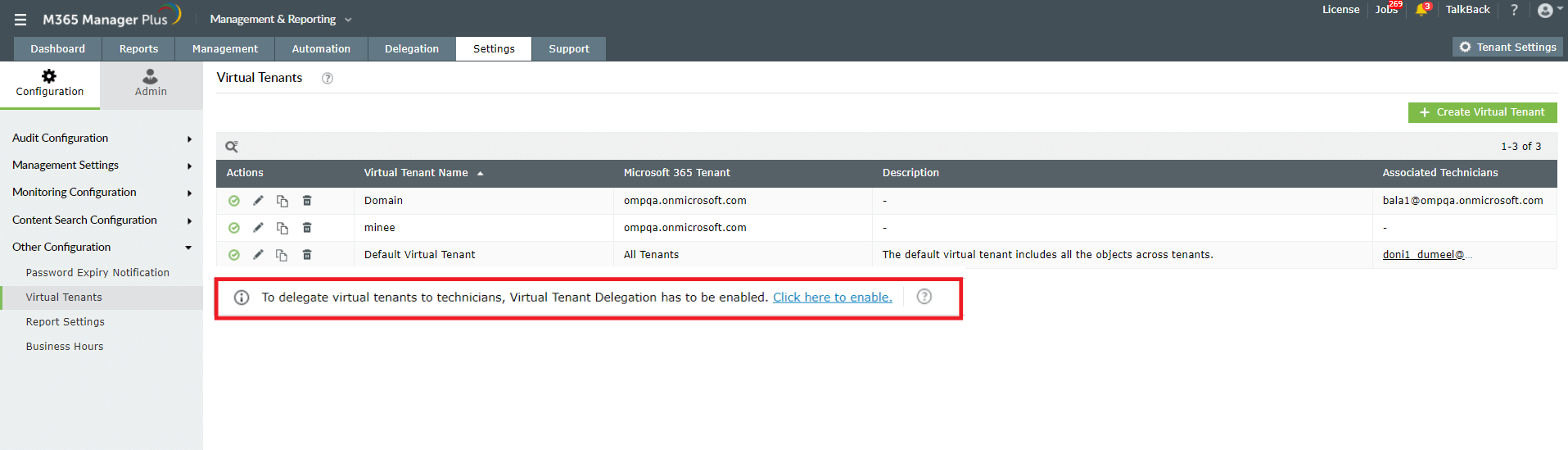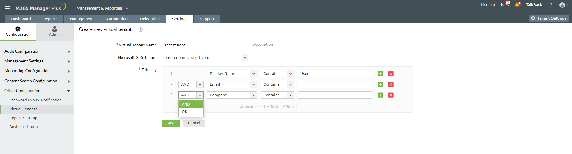 M365 Manager Plus' concept of virtual tenants is segmenting users based on domain, group membership, job location, and other user attributes for administrative requirements. Virtual tenants is what an OU is to the on-premises AD. Administrators can create virtual tenants pertaining to a specific department, team, project, and every possible user group, and delegate management operations on them to technicians.