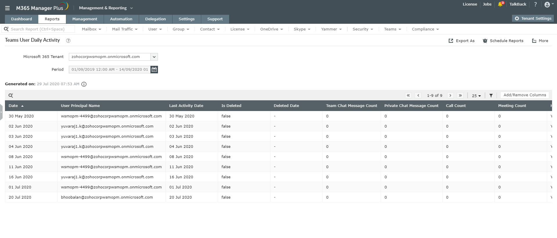 M365 Manager Plus is a comprehensive Microsoft 365 reporting, auditing, management, monitoring, and alerting tool. It gives you predefined reports on various Microsoft Teams-related aspects such as teams, channels, members' details, individual team sizes, activity, and usage information. These reports store data for as long as needed, and you can export the data into four different formats: CSV, PDF, HTML, or XLS.