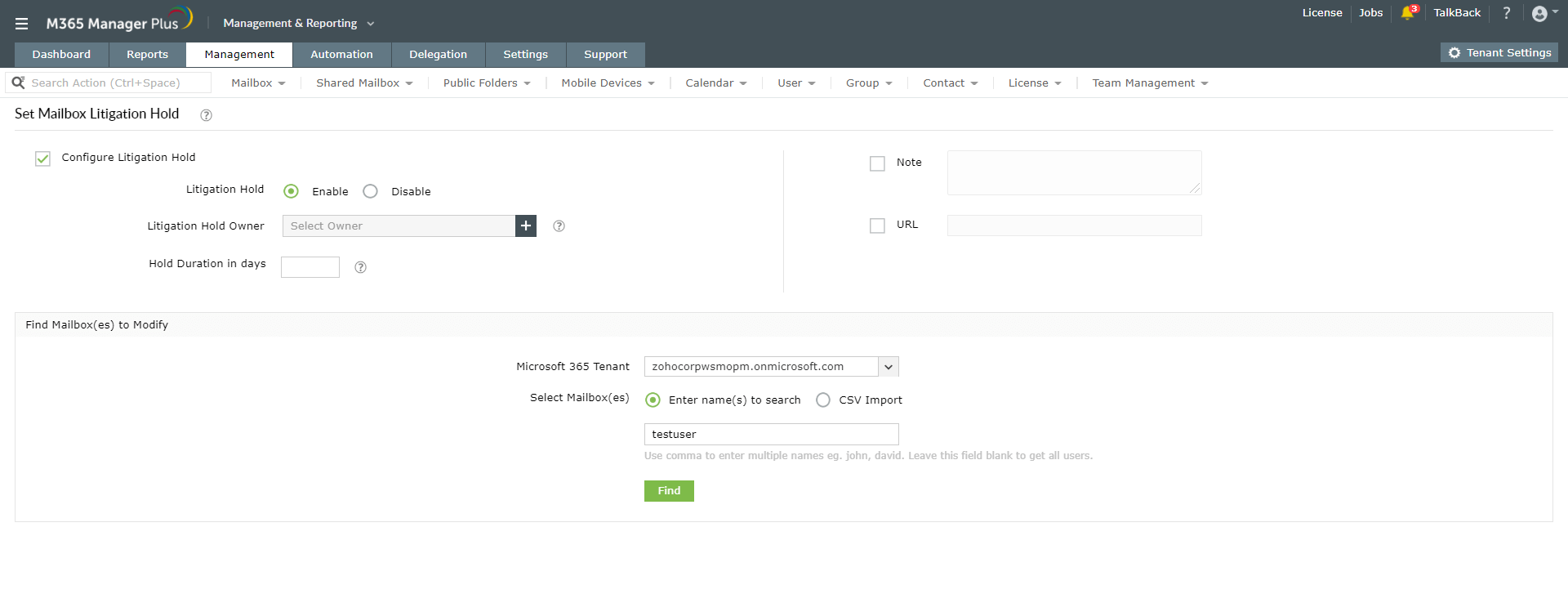 In Microsoft 365, you have to perform the tedious task of enabling Litigation Hold and configuring the retention period for each mailbox individually. M365 Manager Plus helps you put multiple mailboxes under Litigation Hold simultaneously using a CSV file import. You may also select mailbox(es) from other tenants across the organization if you need to. In addition to this, you can set an owner for the Litigation Hold mailbox(ex), to have access permissions to all the files and data stored. To put a mailbox on Litigation Hold using M365 Manager Plus follow the given steps: