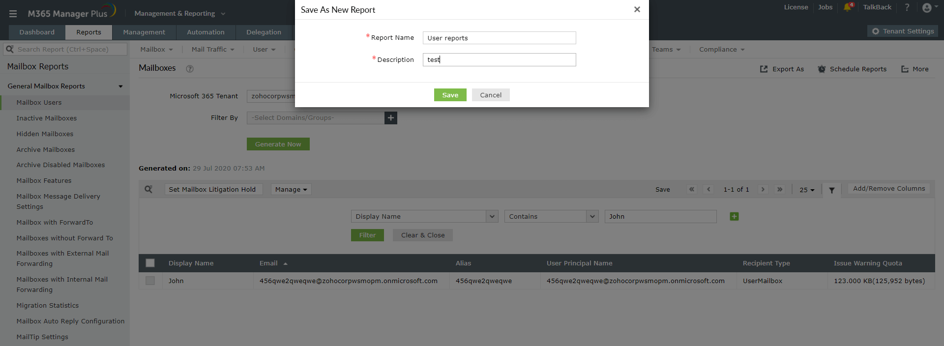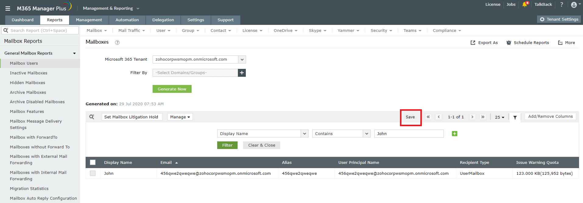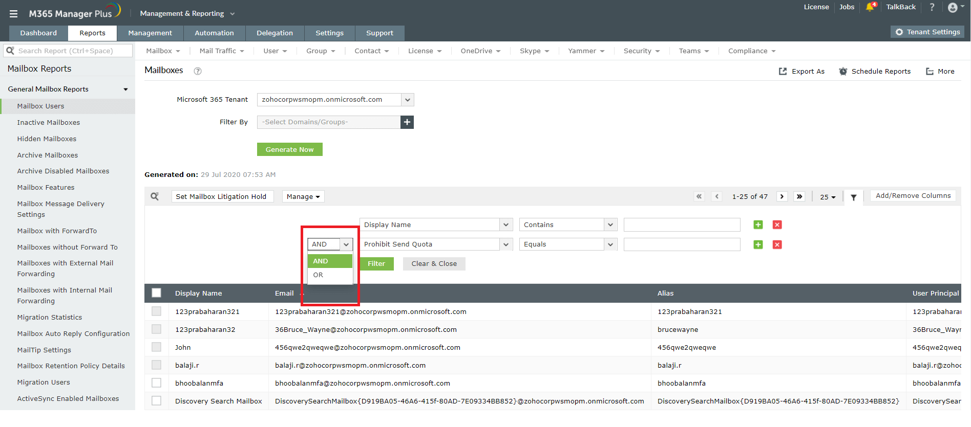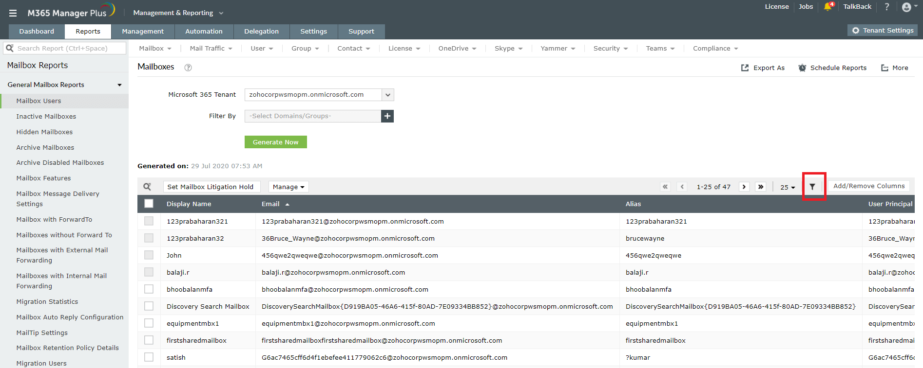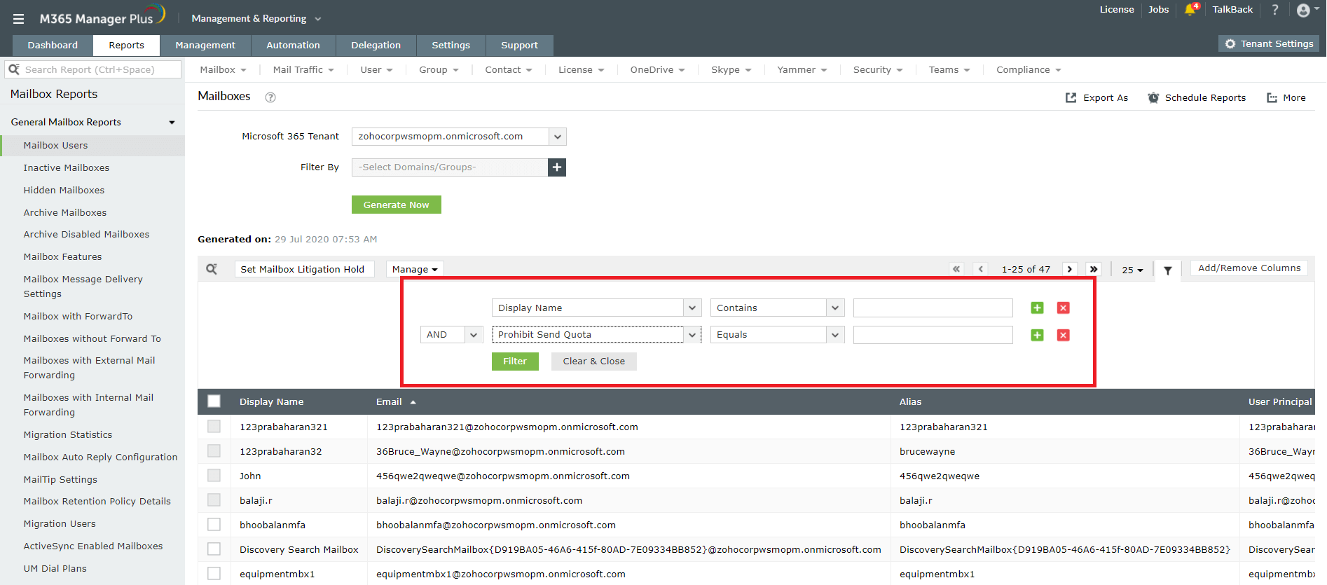 M365 Manager Plus allows to you to retrieve only the required data from a particular report using filters. For example, if you generate mailbox users report, details of all the mailbox users in your organization will be retrieved. But using the filter option you can filter the users based on the display name, email, user principal name, and more.