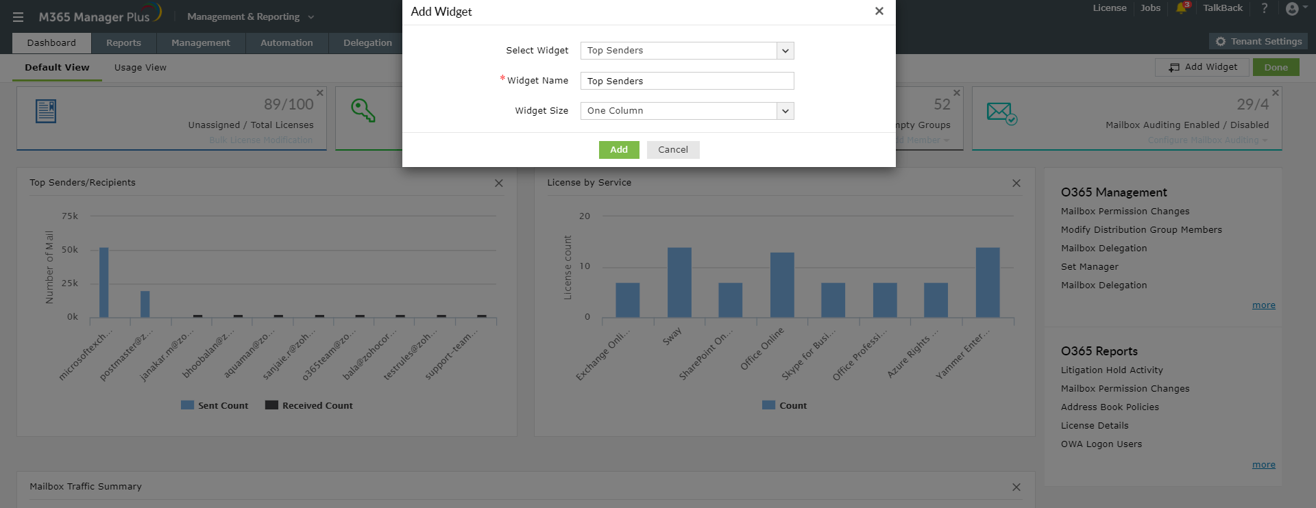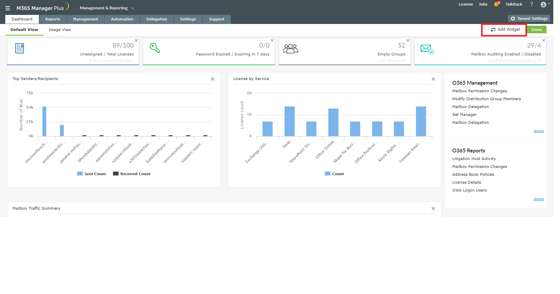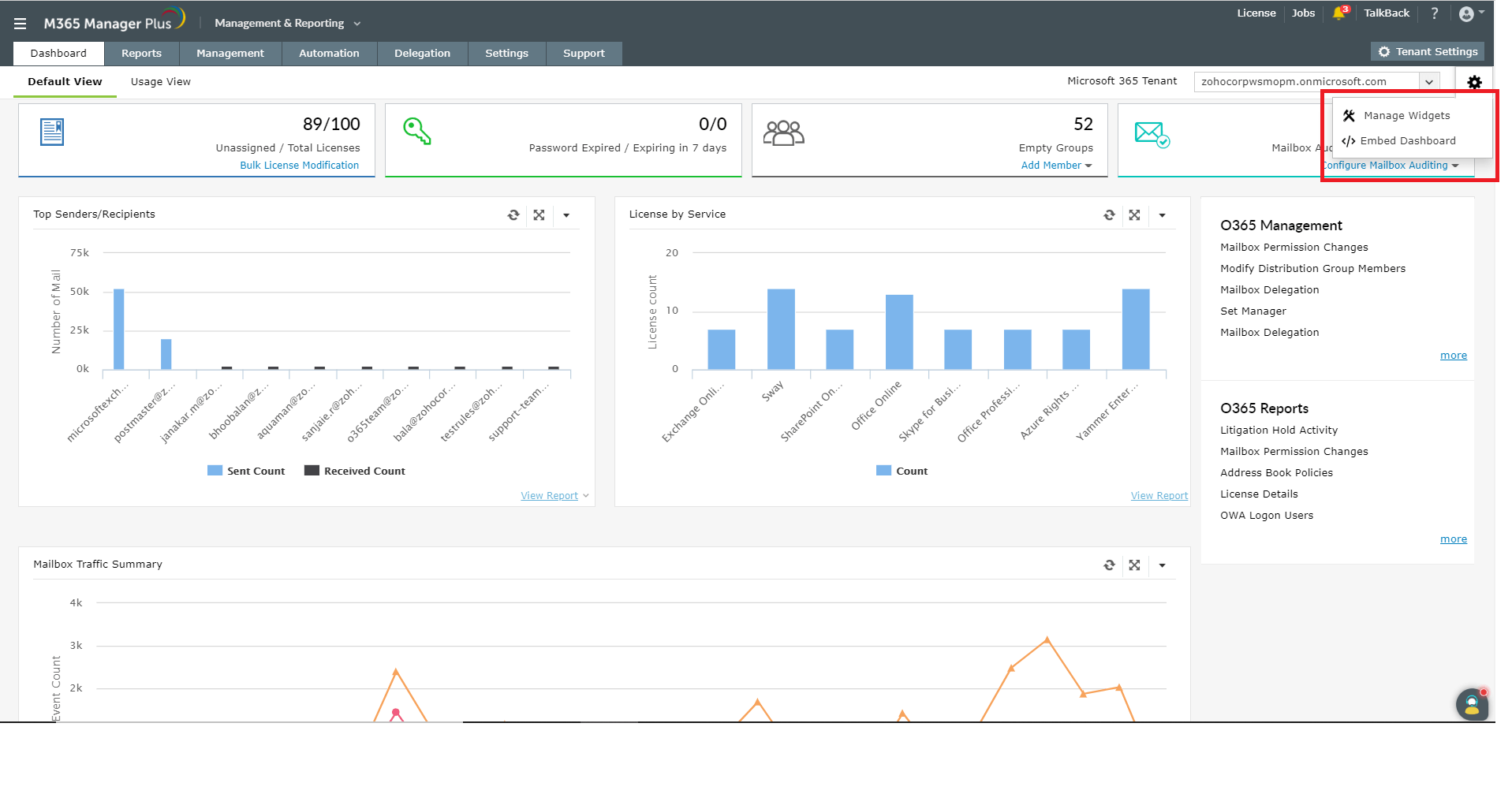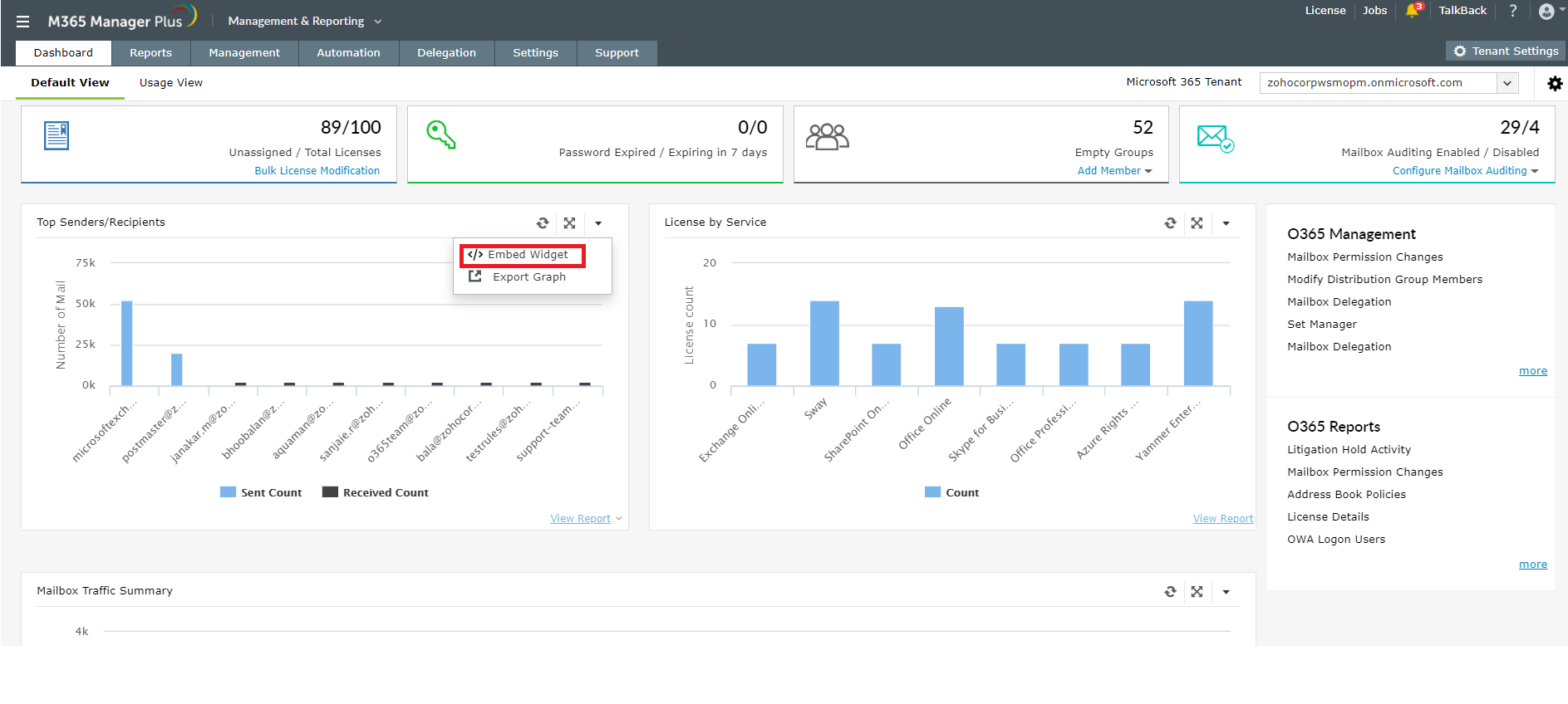 M365 Manager Plus provides you a customizable dashboard in which you can opt to display your desired reports, to take a quick peek whenever you want. You can also embed the dashboard in your desired webpage.