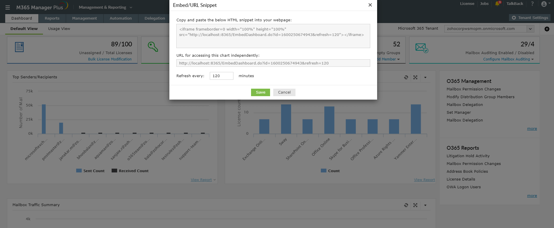 M365 Manager Plus allows you to embed your custom dashboard to any of your webpages for convenience. Don't want to embed the entire dashboard? You can even embed the desired widget alone.