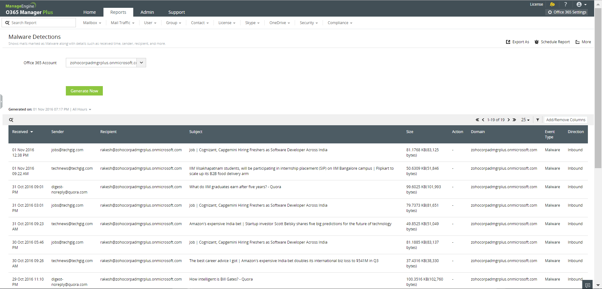 The Spam Detections Report and Malware Detections Report gives you information on mails marked as spam and malware respectively. You can get the sender's email address, recipient's email address, subject of the email, size of the email, and more. With this information you can find out whether the emails are targeted at a particular mailbox or the entire organization.