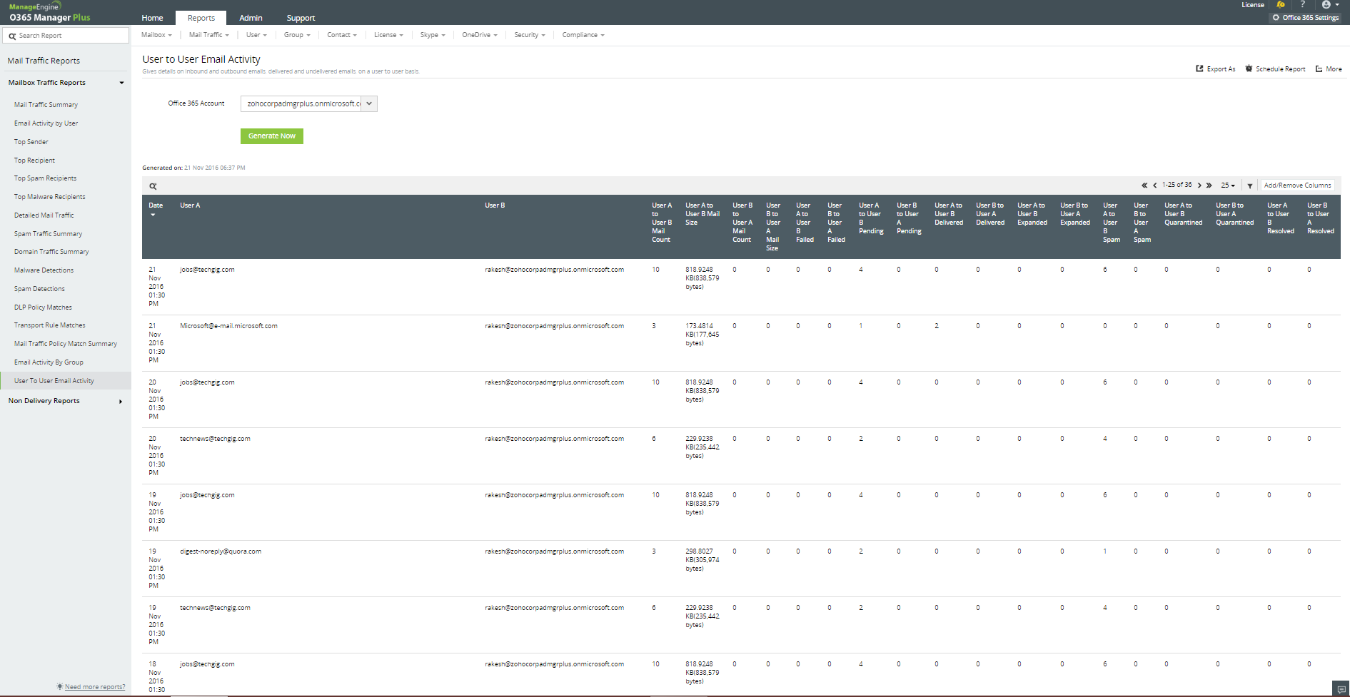 Yes, M365 Manager Plus makes it possible. User to User Email Activity Report gives you the complete summary of emails sent and received between any two particular users. The details include emails count, emails size, emails pending, emails delivered, spams sent and received, and more.