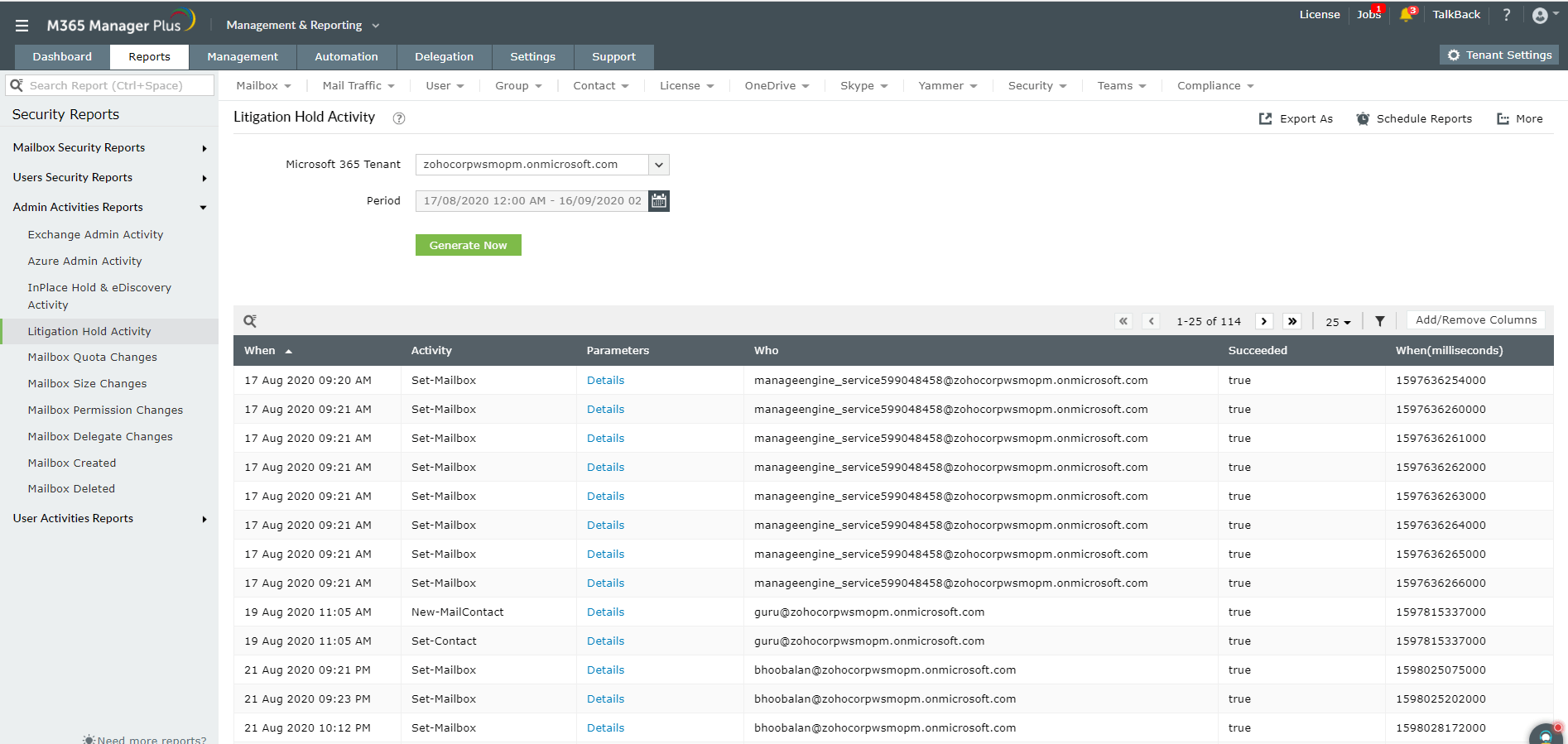 You have to use PowerShell scripts to monitor the permission changes and record it in an Excel sheet to prepare audit reports. M365 Manager Plus automates this entire process. In a single click, you can generate Mailbox Permission Changes Audit Report, which gives you details on all mailbox permission changes. You can even schedule the report to be generated at designated intervals and have it emailed to you.