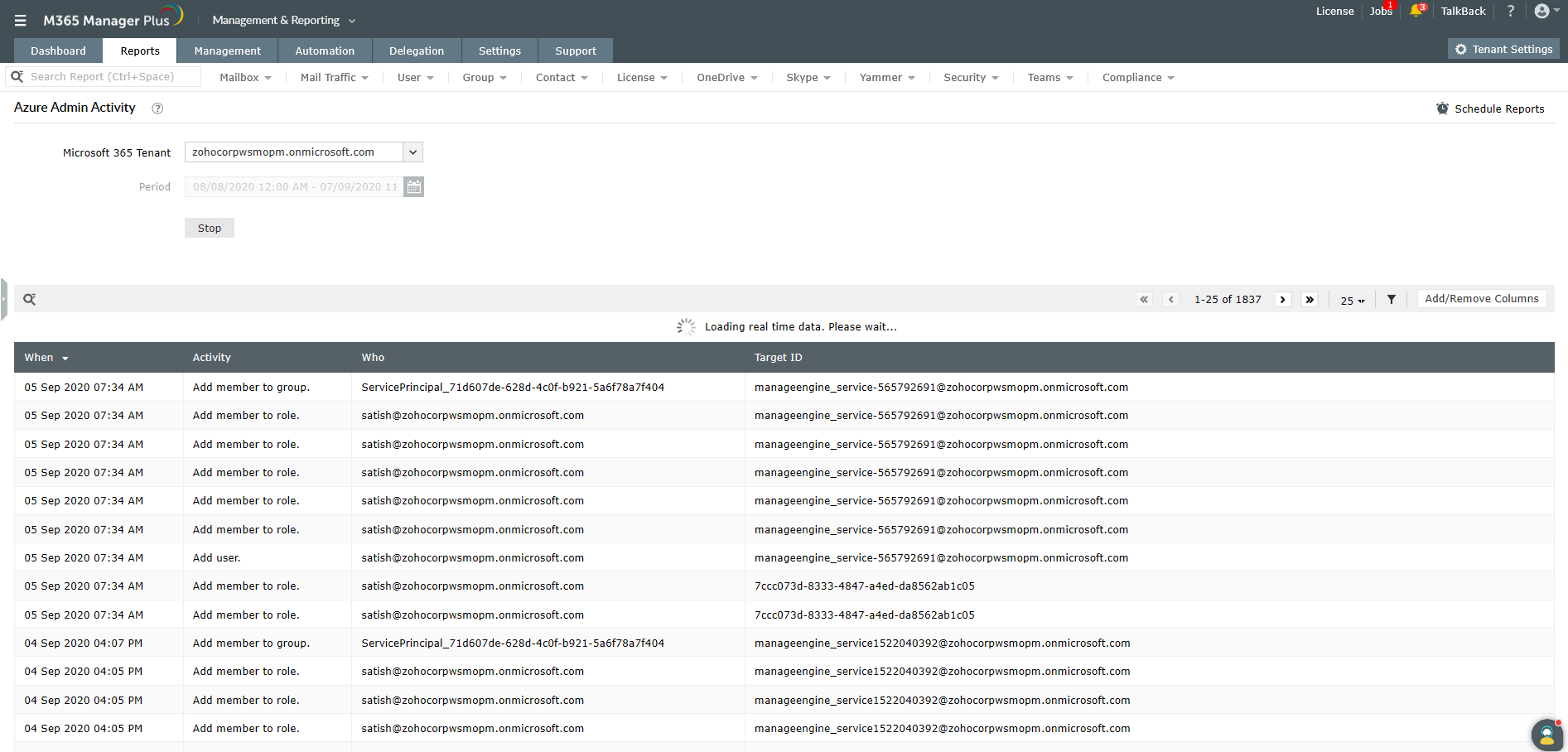深入了解管理员在管理组织的Azure Active Directory中执行的所有杂项。M365 Manager Plus持续监视,审核和报表Azure管理员的活动,并有助于确保组织目录的完整性和安全性。