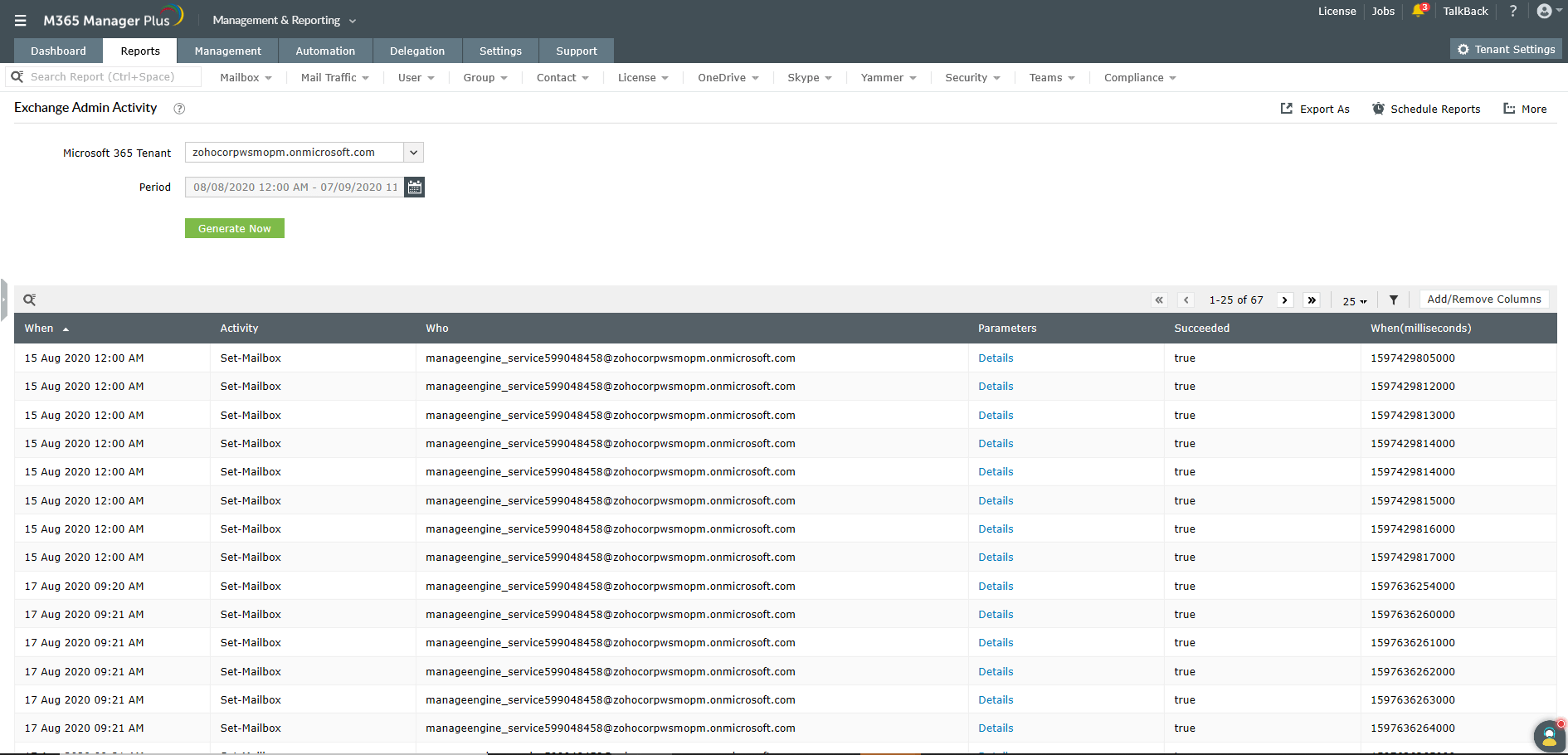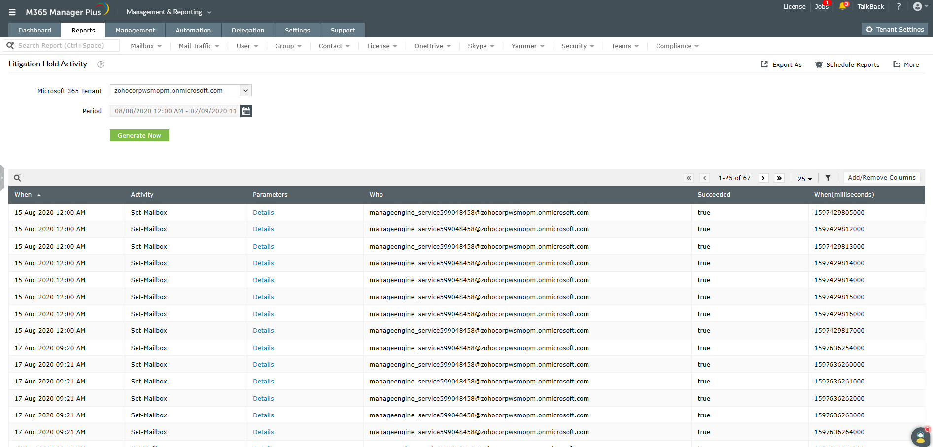 通过使用M365 Manager Plus活动报表监控Microsoft 365环境中的所有管理员活动,从而增强组织的安全性。这些报表还提供有关Exchange管理员对合法保留对象进行的所有更改的详细信息。