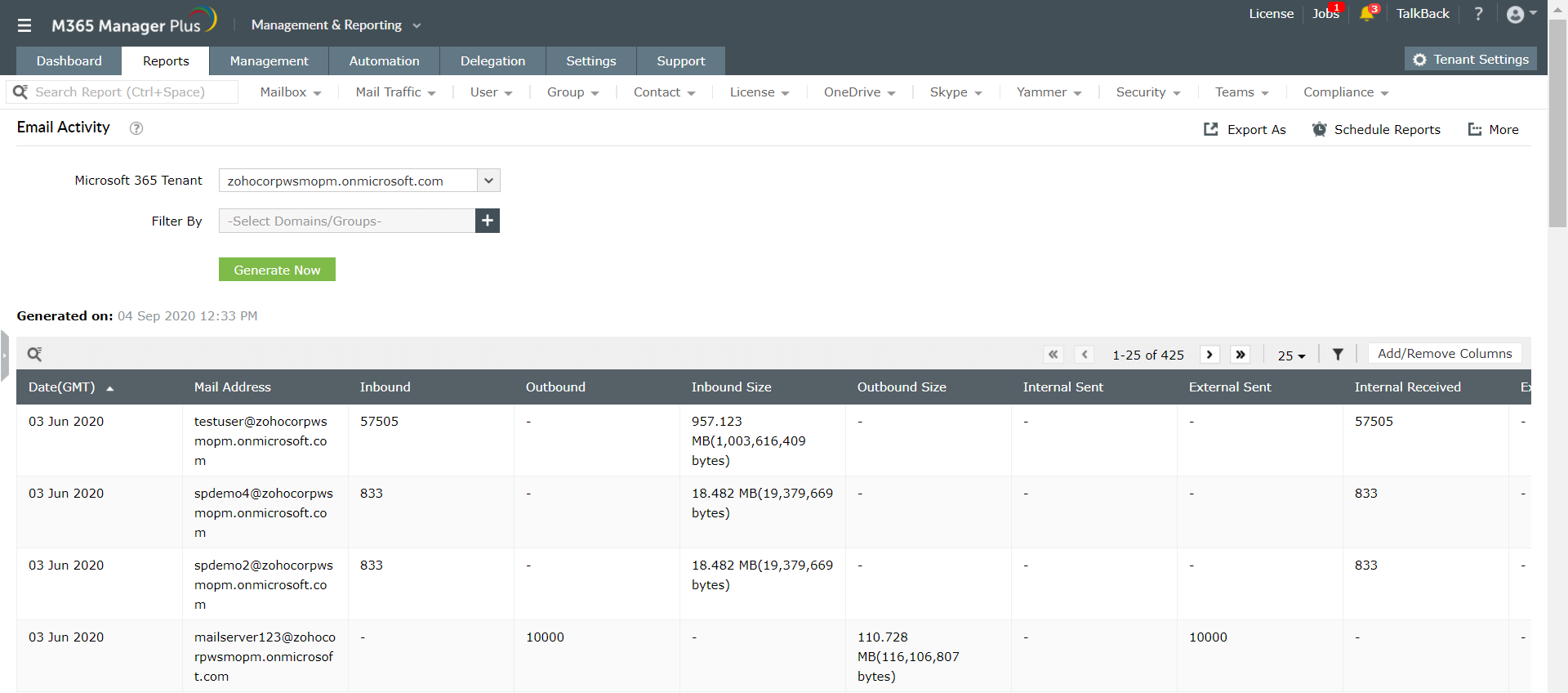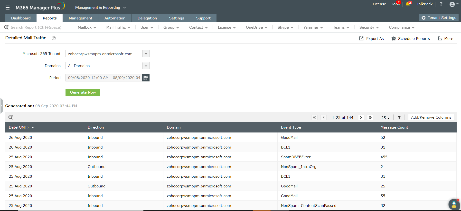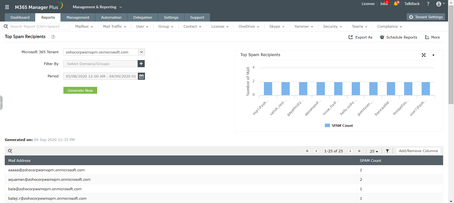 使用完整的Microsoft 365解决方案M365 Manager Plus, 可以将这些报表安排为以固定的时间间隔运行,通过电子邮件发送给管理员,并导出为CSV,XLS(Microsoft Excel),PDF(Adobe Acrobat)或HTML格式。