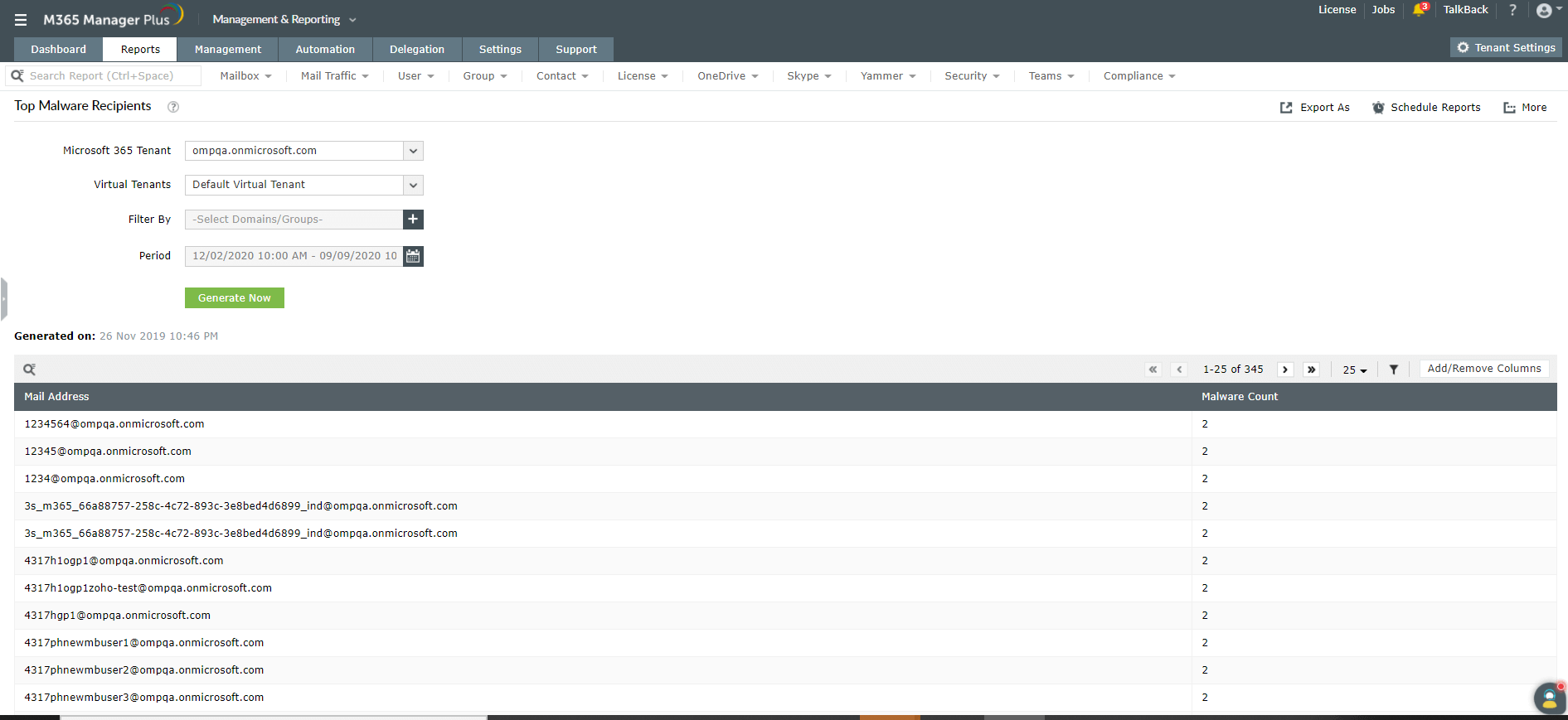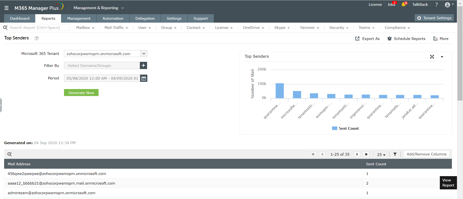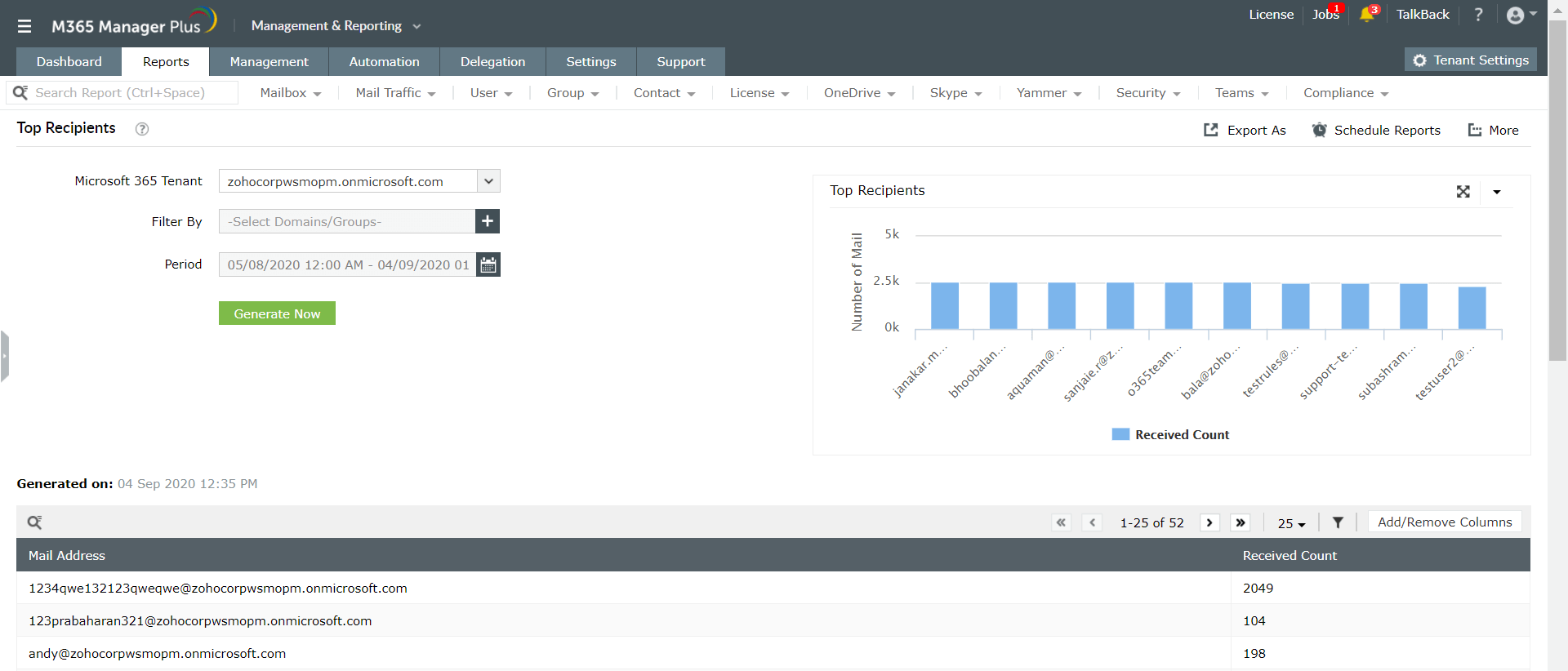 使用完整的Microsoft 365解决方案M365 Manager Plus, 可以将这些报表安排为以固定的时间间隔运行,通过电子邮件发送给管理员,并导出为CSV,XLS(Microsoft Excel),PDF(Adobe Acrobat)或HTML格式。