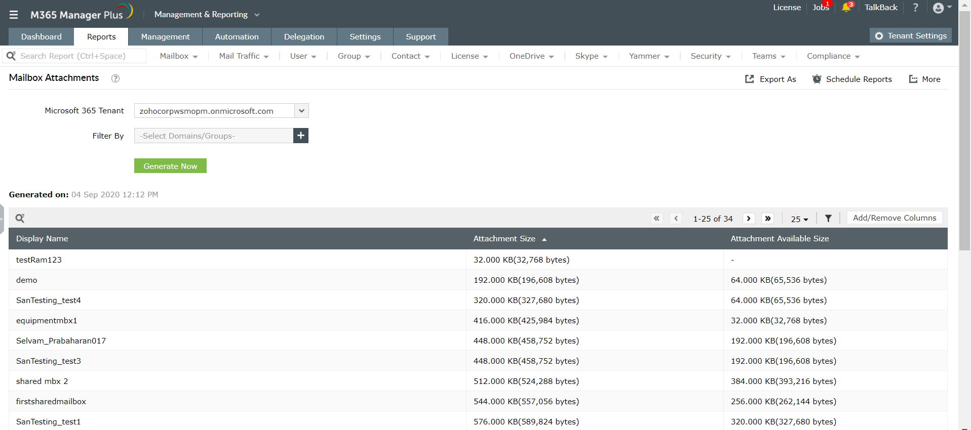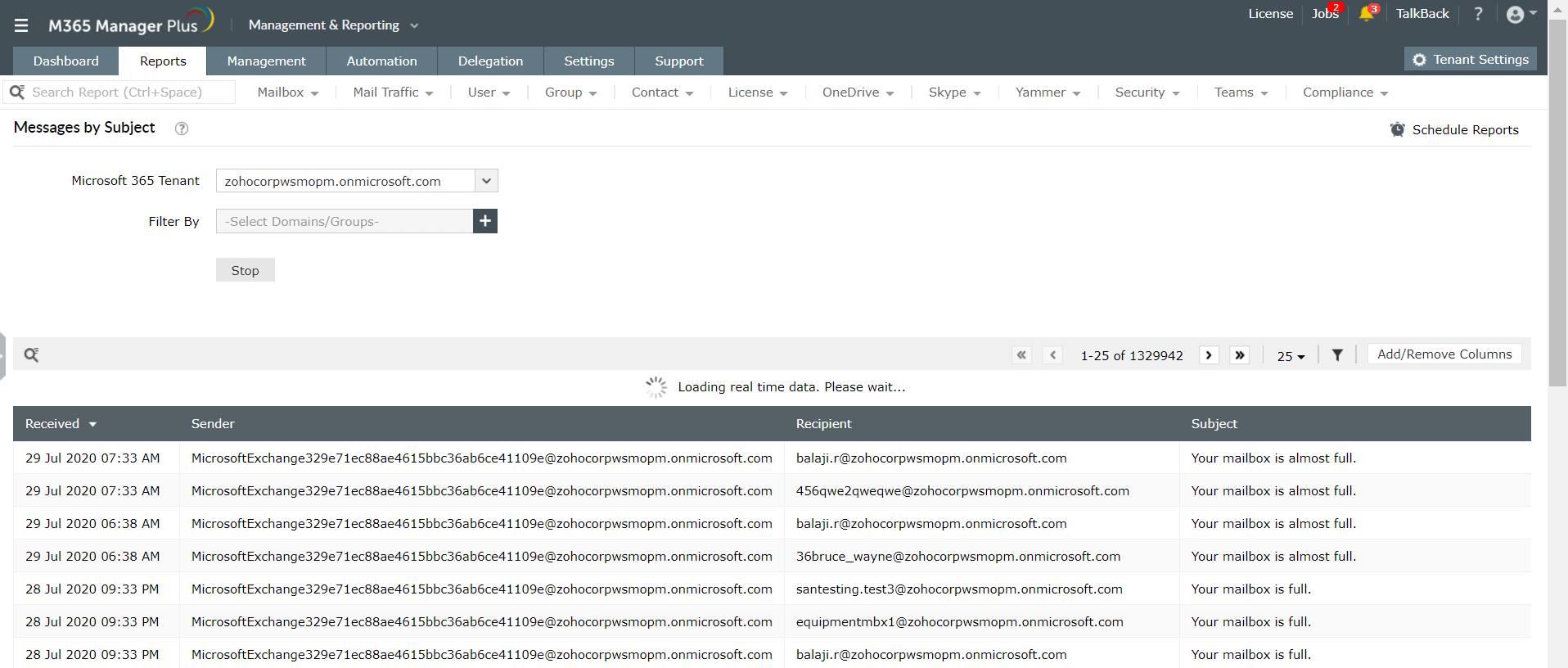 M365 Manager Plus提供有关组织中所有邮箱内容的详细报表,其邮箱内容报表可帮助您通过各种参数(例如文件夹大小,邮件计数,邮件主题和附件文件大小)过滤邮箱。