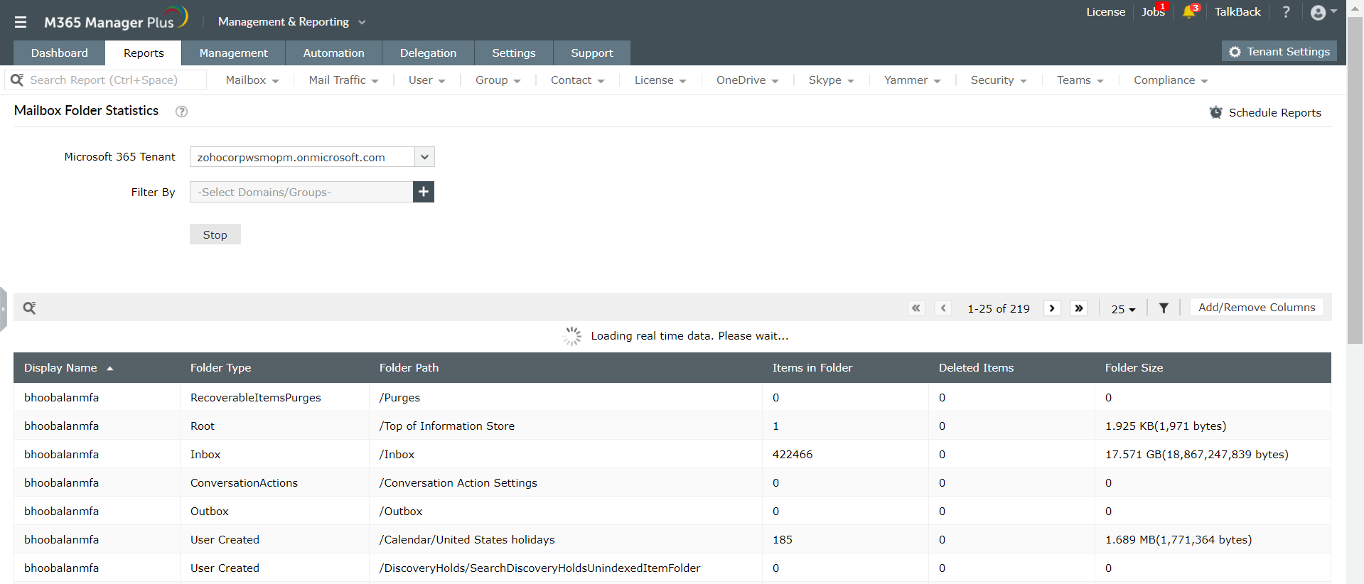 此报表收集有关每个邮箱中存在的邮件数以及组织中每个Microsoft 365邮箱使用的空间的数据,当需要快速了解每个邮箱中的文件夹时,此报表会派上用场。该报表还为您提供有关每个邮箱中子文件夹的数量,每个文件夹的大小以及是否可移动的信息。