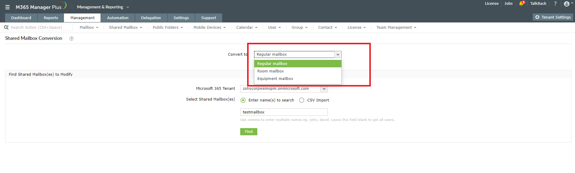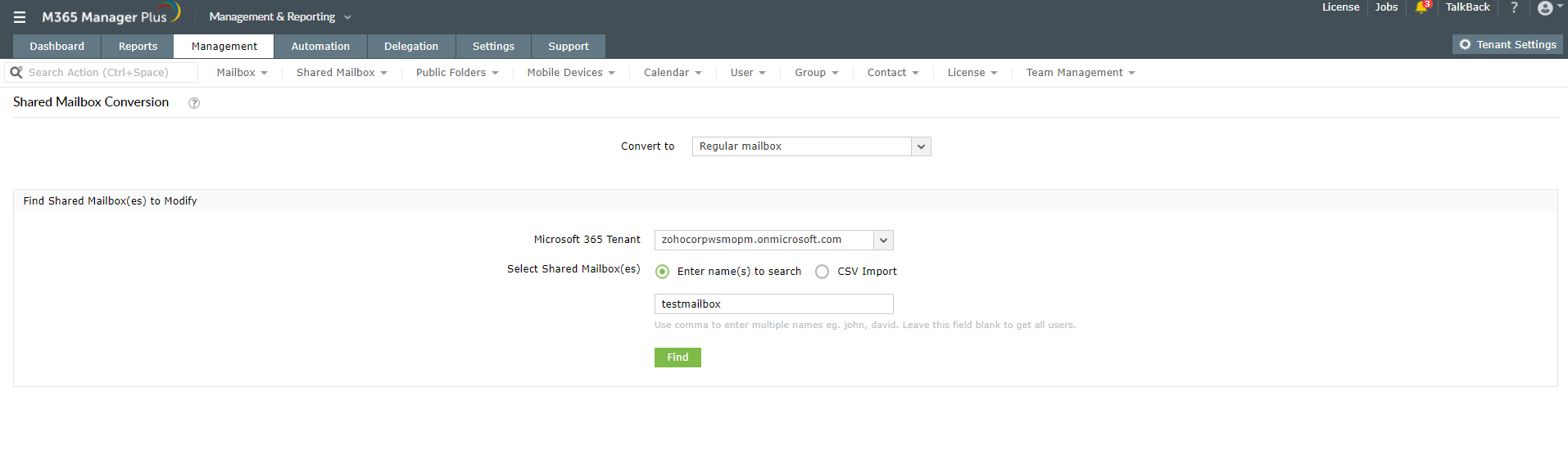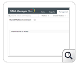 与不能批量管理共享邮箱的Microsoft 365管理中心不同,M365 Manager Plus可以一次单击即可将任意数量的常规邮箱转换为共享邮箱,而无需PowerShell脚本。