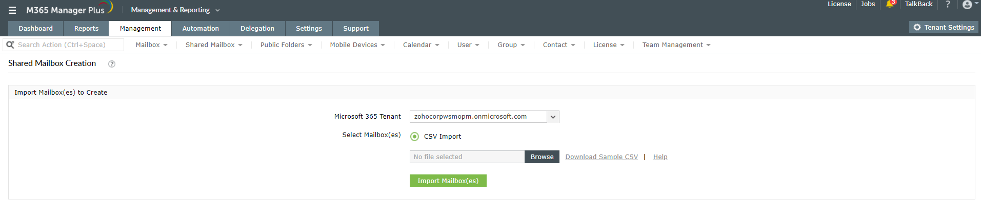 借助M365 Manager Plus,您可以一口气为每个现有部门创建共享邮箱,而无需PowerShell脚本。创建包含所需信息的CSV文件,并将其上传到工具的共享邮箱创建页面(“管理”→“共享邮箱管理”→“共享邮箱创建”)。CSV文件上传后,M365 Manager Plus将负责其余的工作。