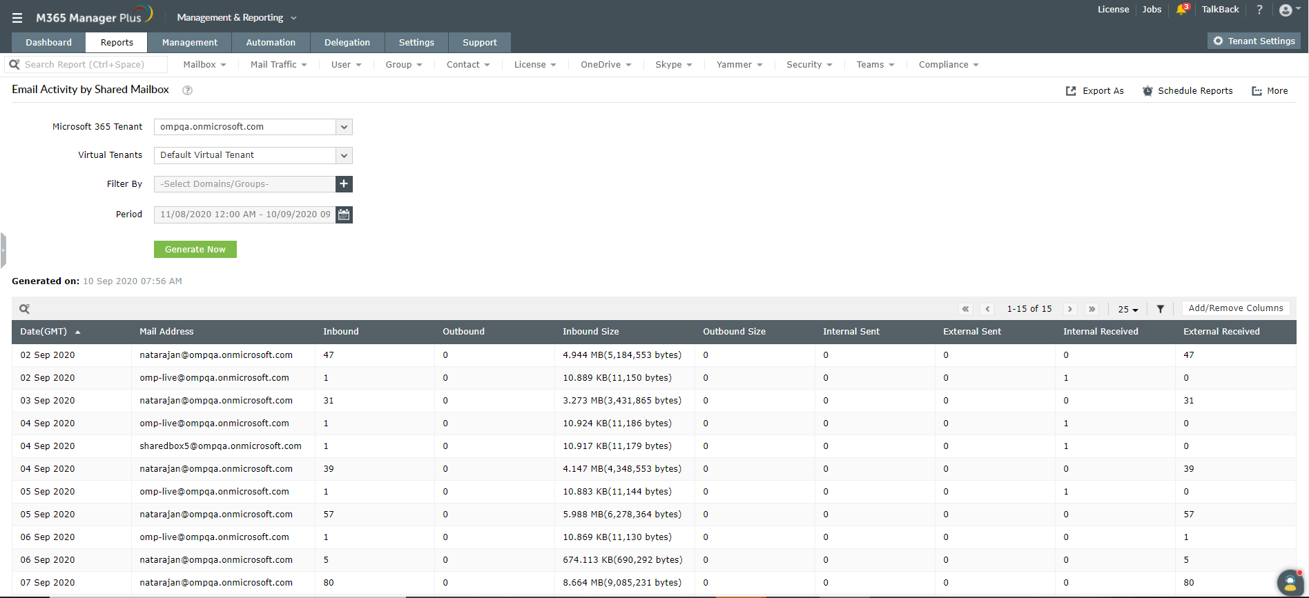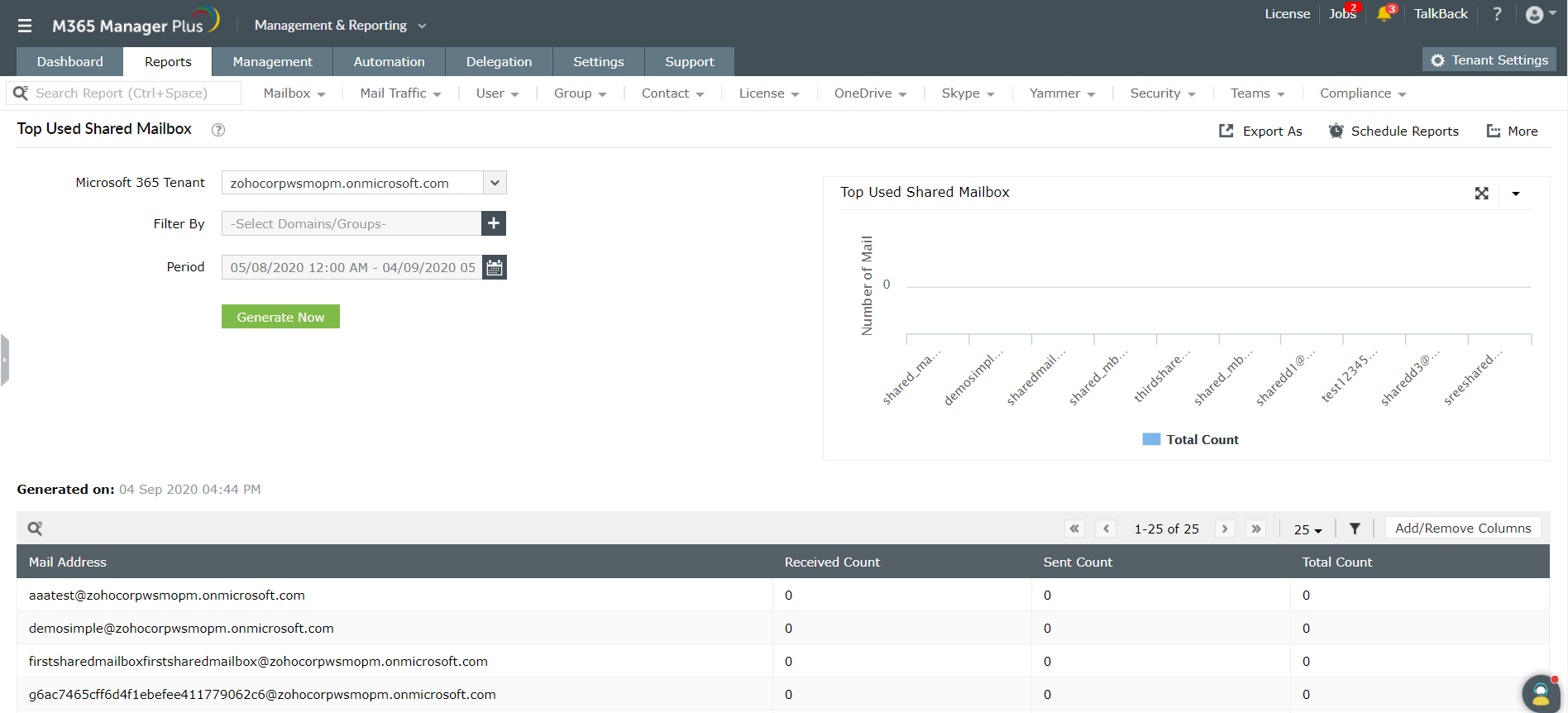 提供有关具有最大入站和出站电子邮件数量的共享邮箱的详细信息。它为他们的电子邮件地址提供在指定的持续时间内各自的已接收电子邮件计数,已发送电子邮件计数和总电子邮件计数。
