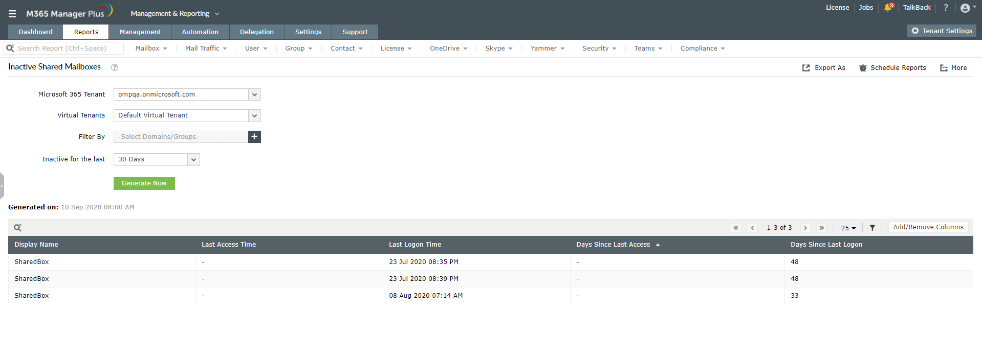 使用完整的Microsoft 365解决方案M365 Manager Plus, 可以将这些报表安排为以固定的间隔运行,通过电子邮件发送给管理员,并导出为CSV,XLS(Microsoft Excel),PDF(Adobe Acrobat)或HTML格式。