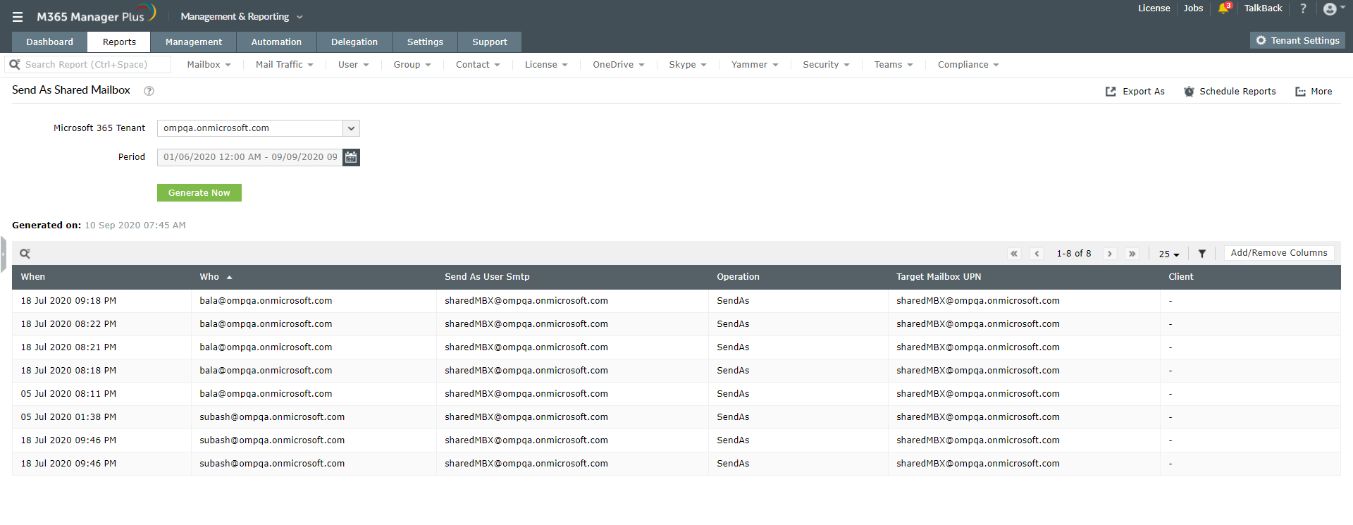 具有“发送为”权限的用户可以从另一封电子邮件发送电子邮件,并使该电子邮件看起来像是从共享邮箱发送的。M365 Manager Plus的此报表显示了在指定期限内哪些用户使用了此权限,使用该权限的时间,客户端IP地址等。
