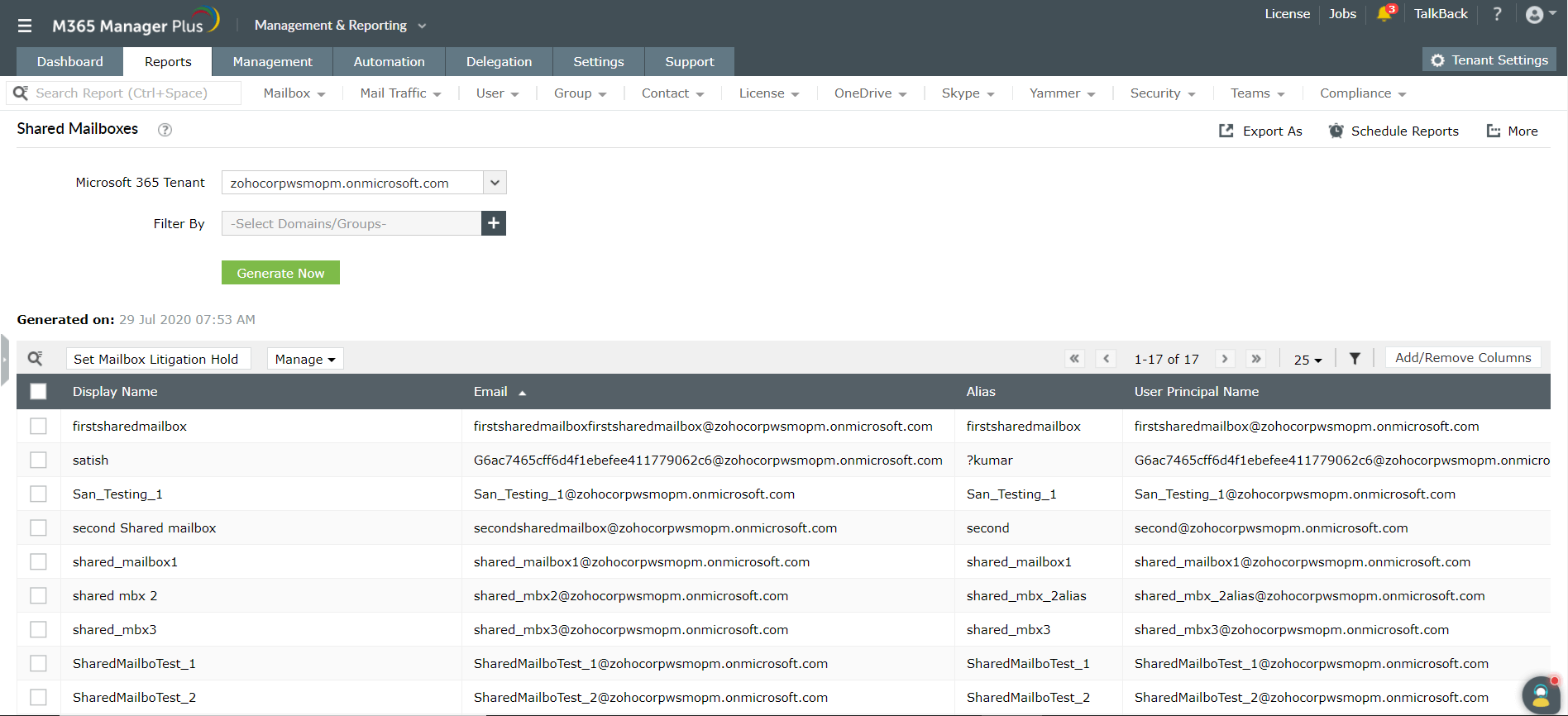 概述Microsoft 365环境中的所有共享邮箱,并提供诸如显示名称,对象ID,别名等详细信息,以便您可以决定是添加还是删除共享邮箱。