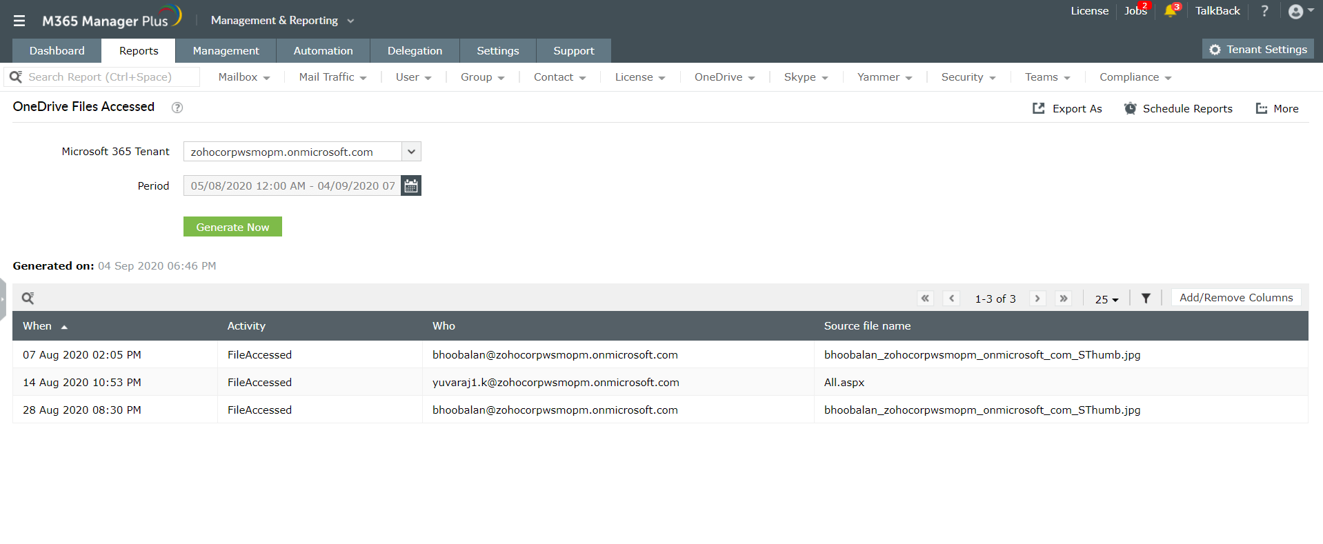 通过M365 Manager Plus的“文件访问”报表,可以完全查看对OneDrive for Business环境中敏感文件和文件夹的访问。它提供了有关谁在何时何地访问了哪些文件的有价值的信息,因此您可以主动检测并响应由未授权访问引起的任何安全漏洞。