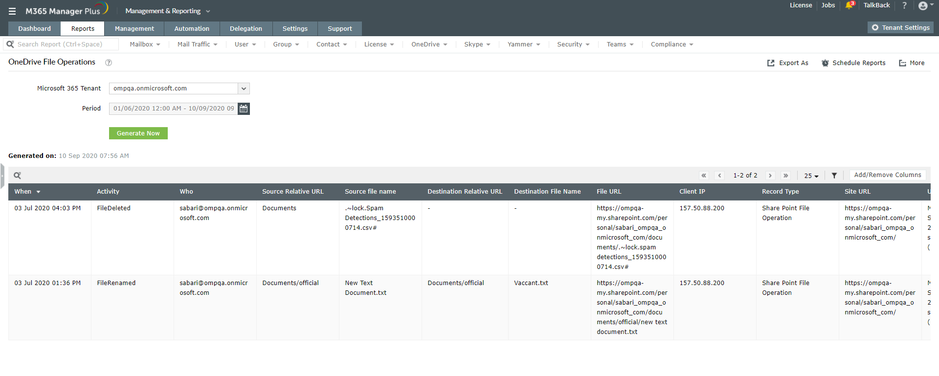 M365 Manager Plus还提供了内置过滤器,可自定义您的OneDrive for Business文件操作报表,以便您仅查看所需的信息。您甚至可以将此信息另存为单独的自定义报表,以与所有其他预配置报表一起查看。此外,您可以计划何时生成报表,并将其导出为PDF,XLS,HTML和CSV文件格式。