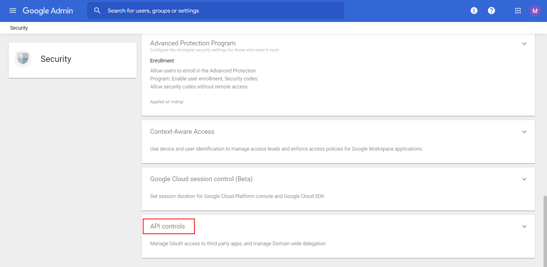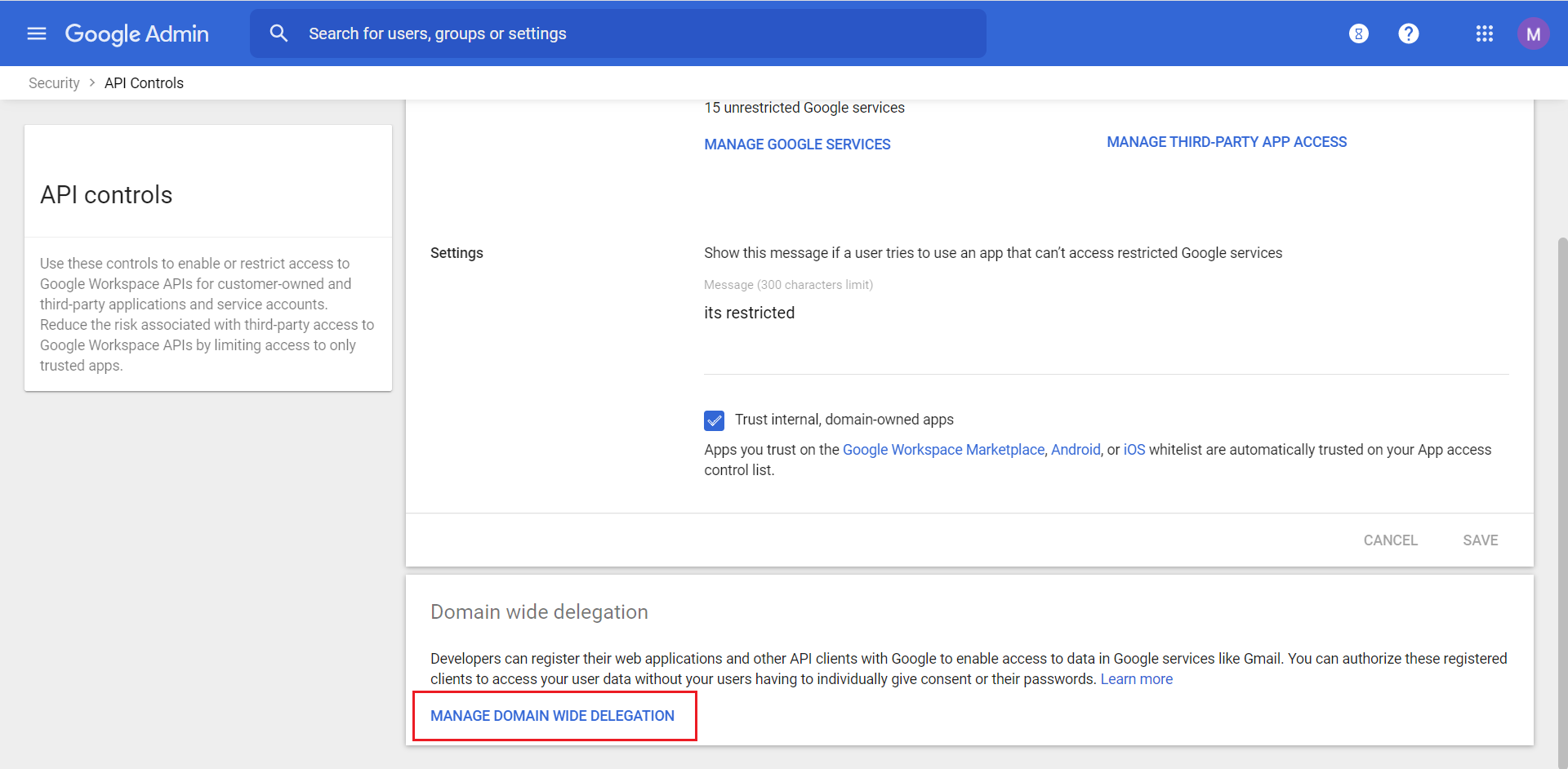 向下滚动并选择API控件 -> Managed Domain Wide Delegation -> 添加。