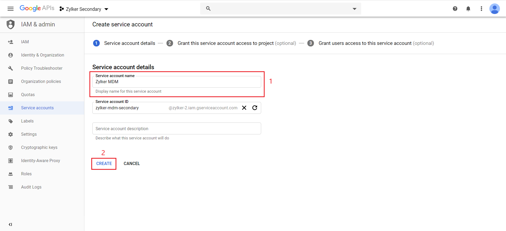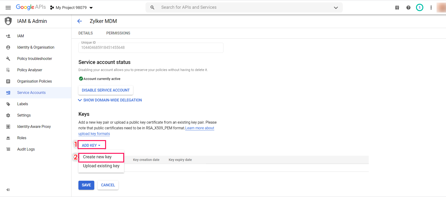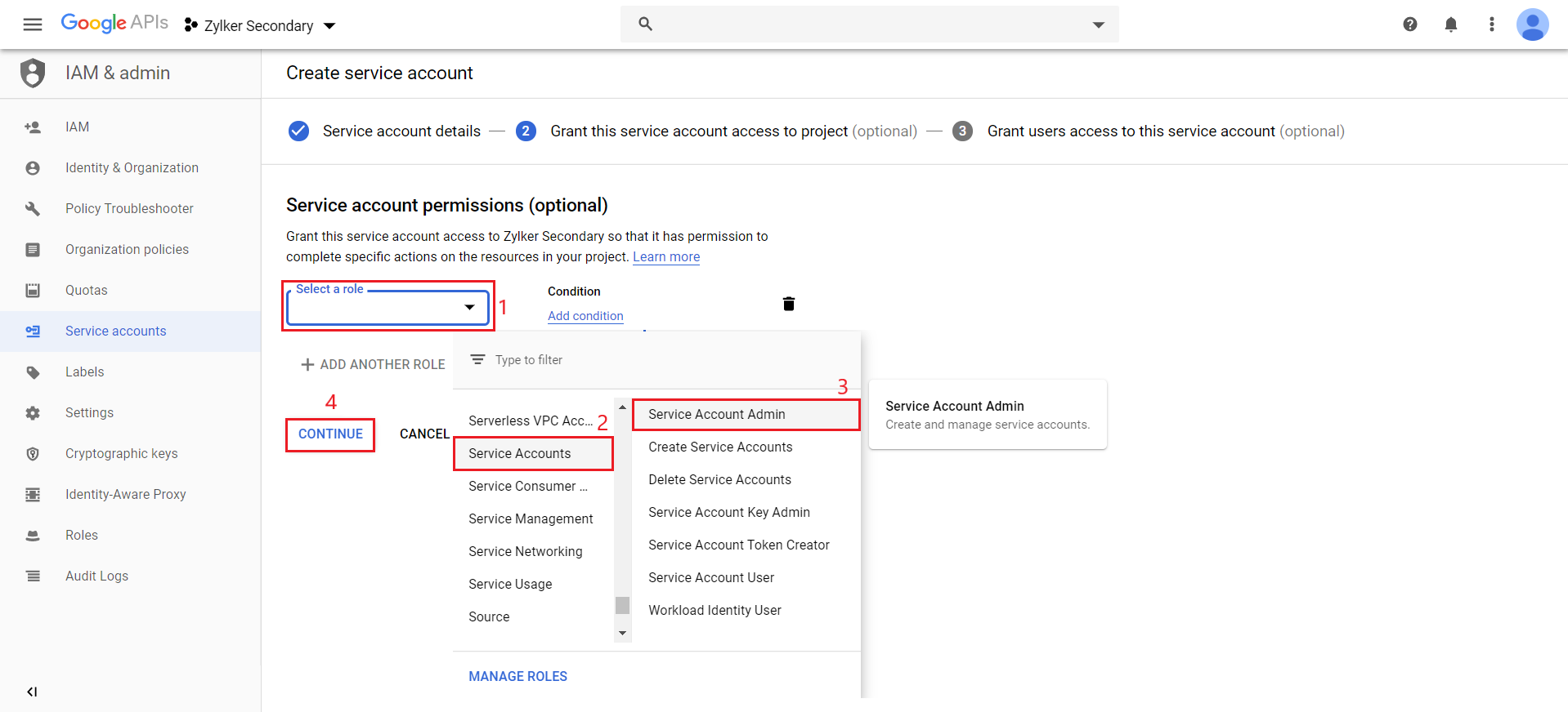 在服务帐户的下拉菜单中选择新建服务帐户。提供服务账户名称,从角色的下拉列表中选择服务账户,并选择服务账户管理员。