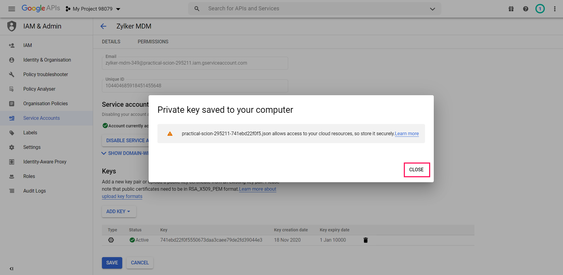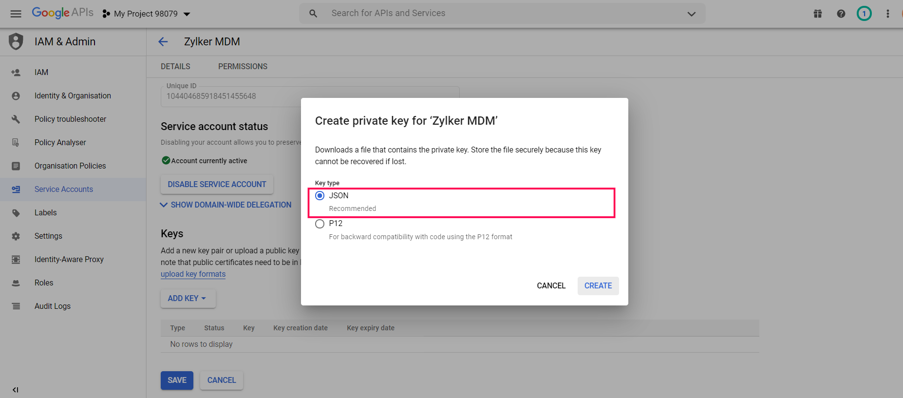 在密钥部分,点击添加密钥,创建新密钥,密钥类型选择JSON,点击创建。此处下载的JSON令牌需要上传到MDM服务器。令牌下载完成后,点击关闭。