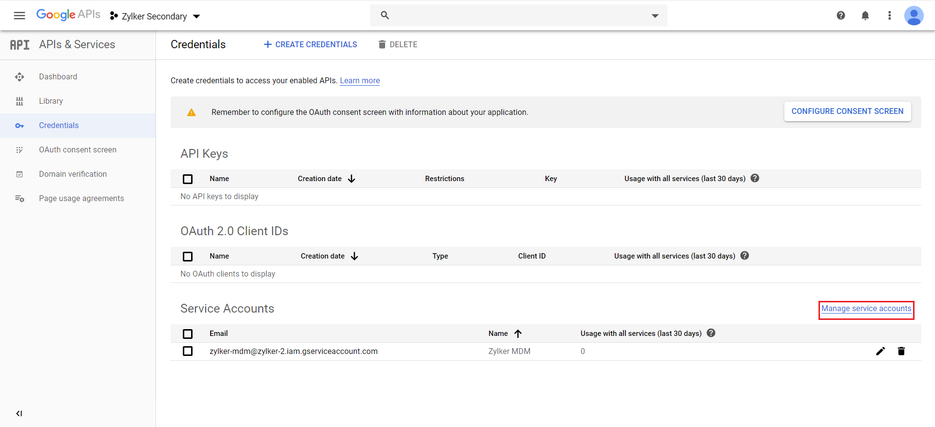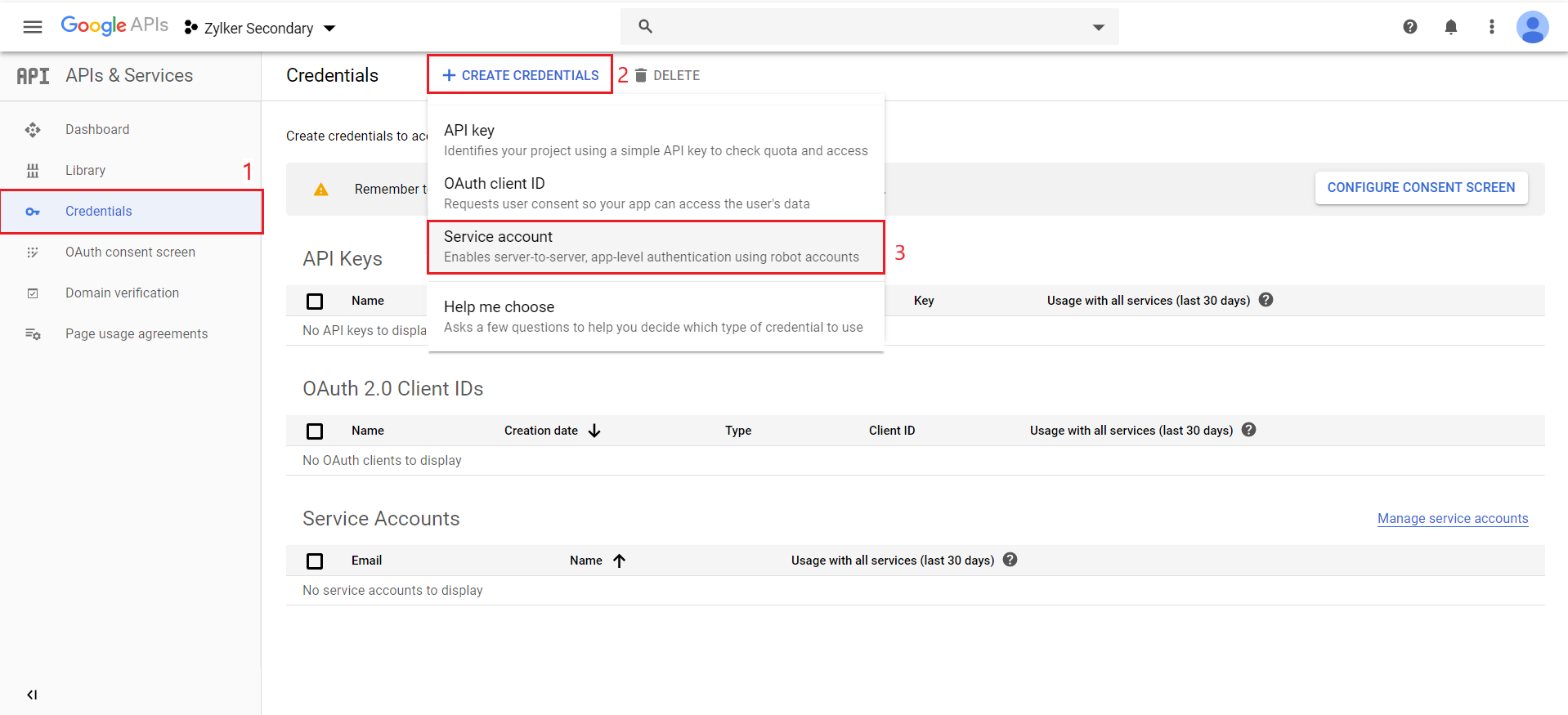 点击左边的钥匙图标,点击创建凭证并从下拉列表中选择服务账户。