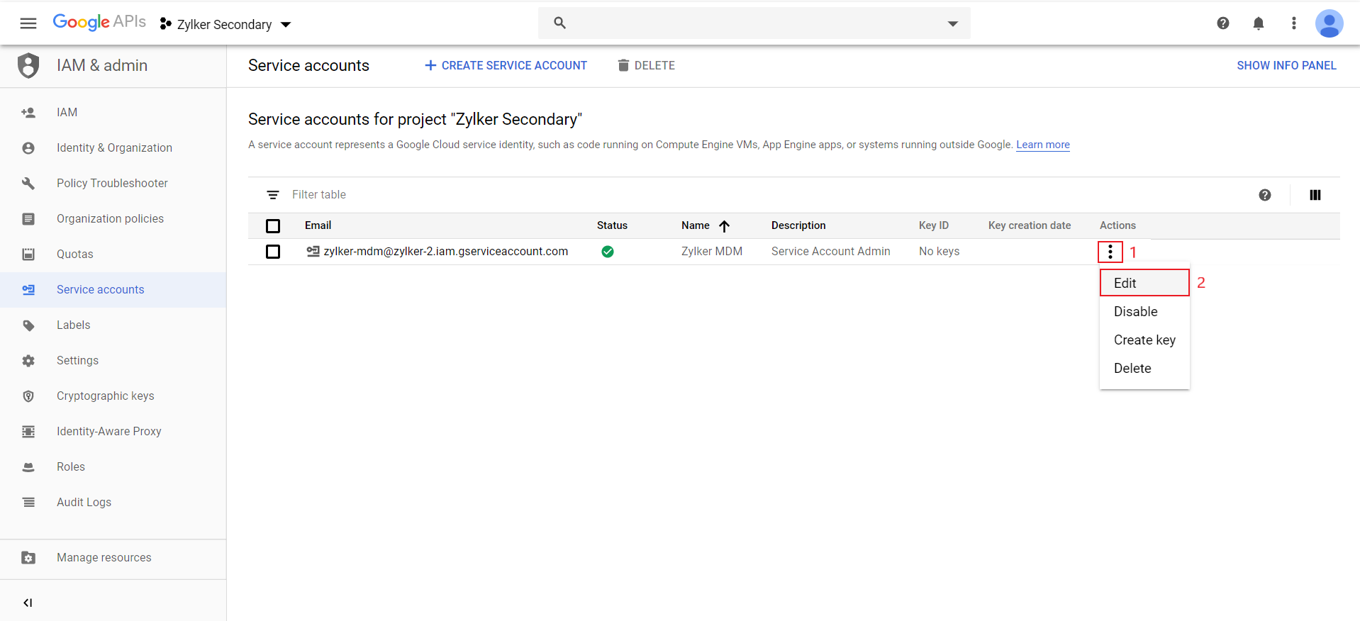点击关闭后,请点击管理服务账户。点击服务账户名称对应的省略号图标,选择编辑。