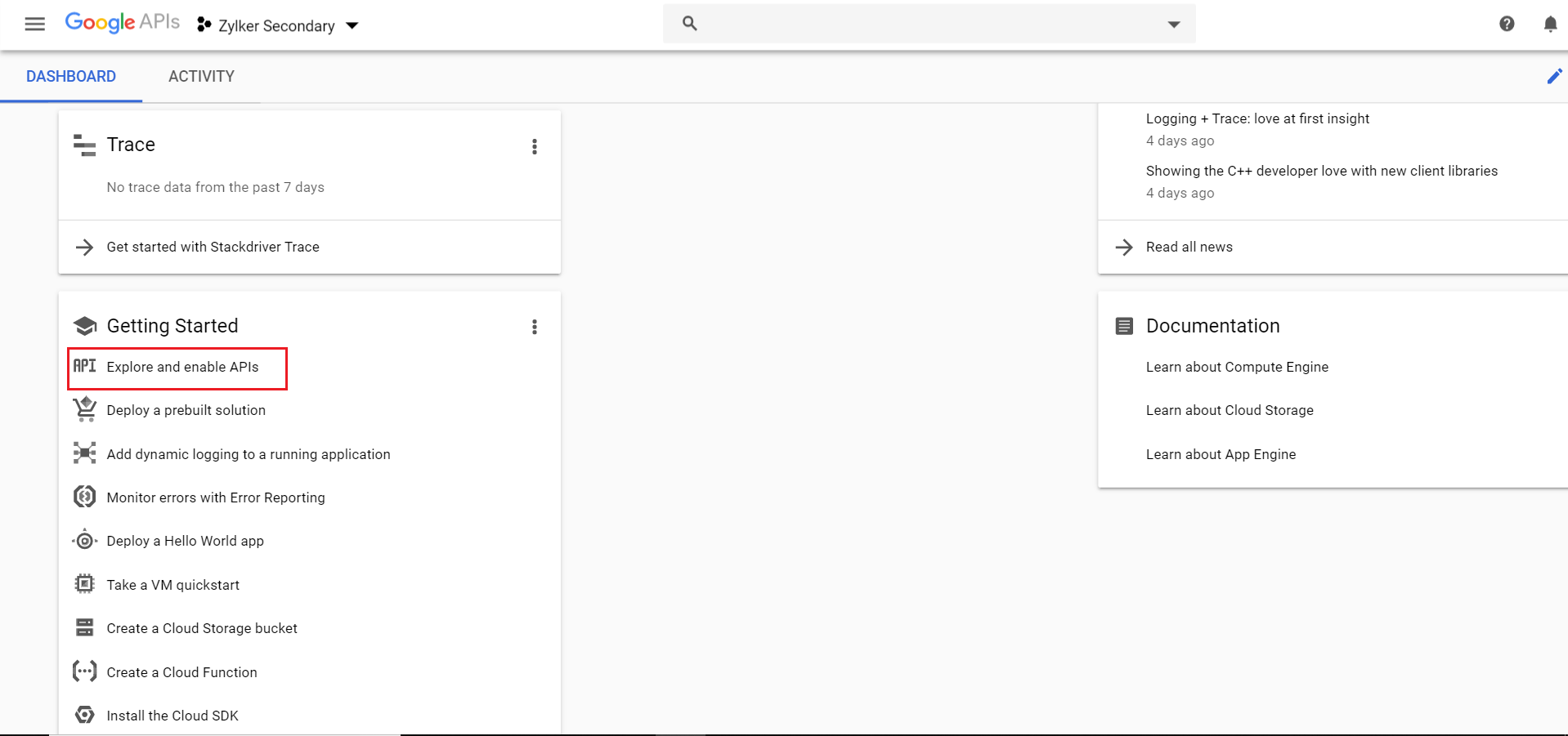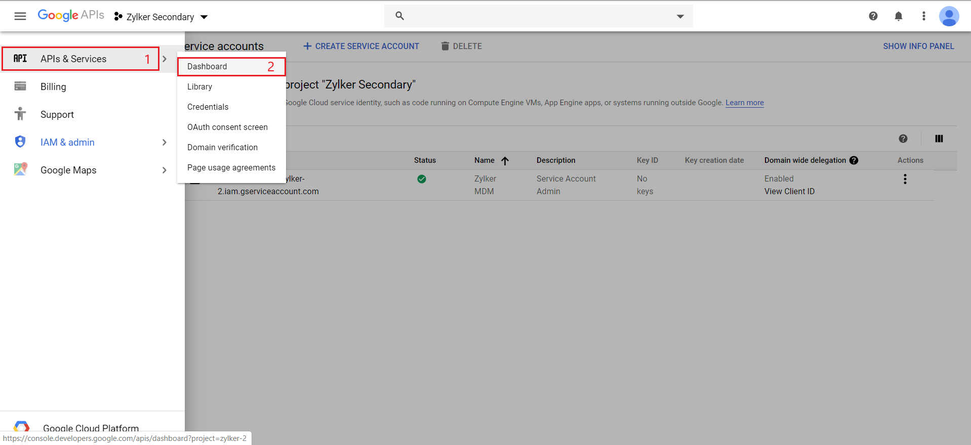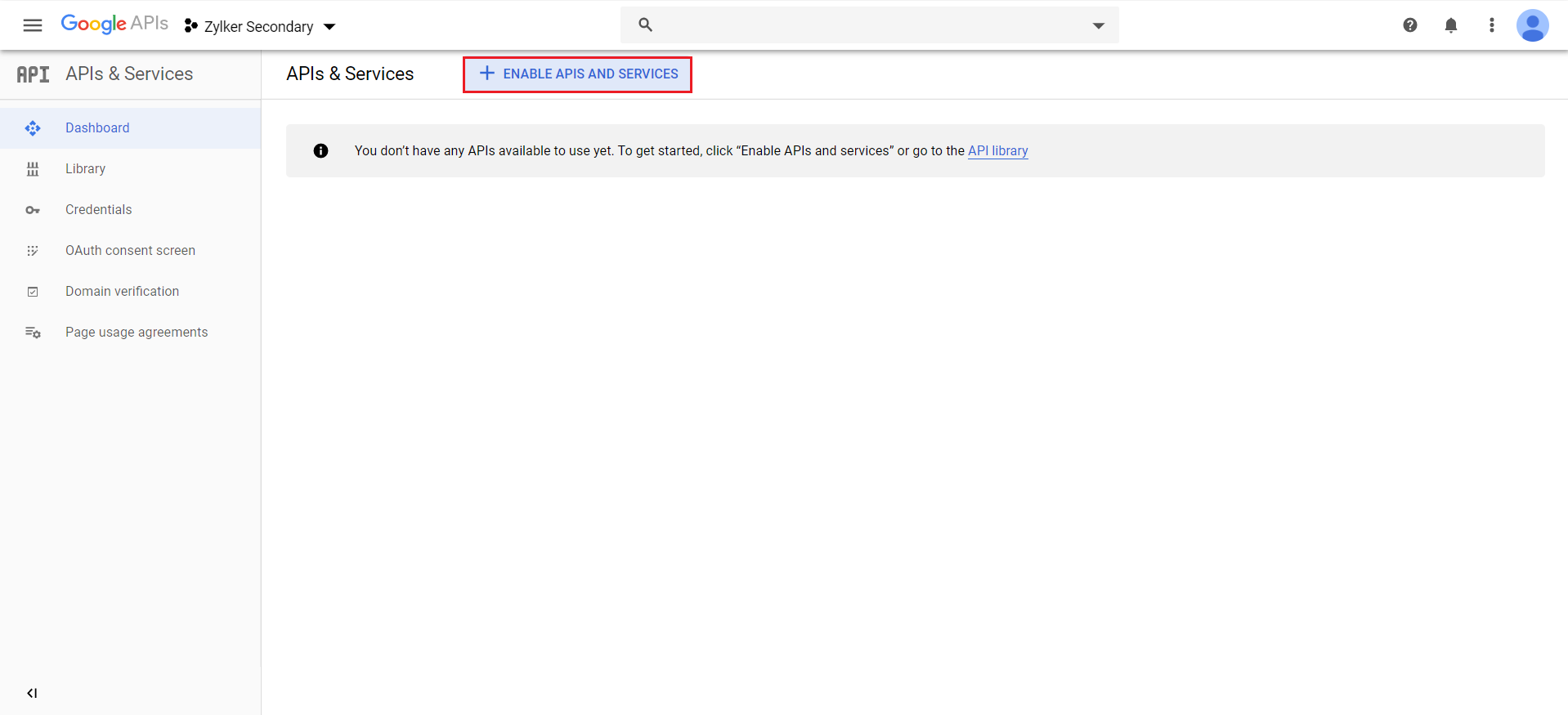 点击汉堡图标,点击菜单中的API和服务并选择仪表板。