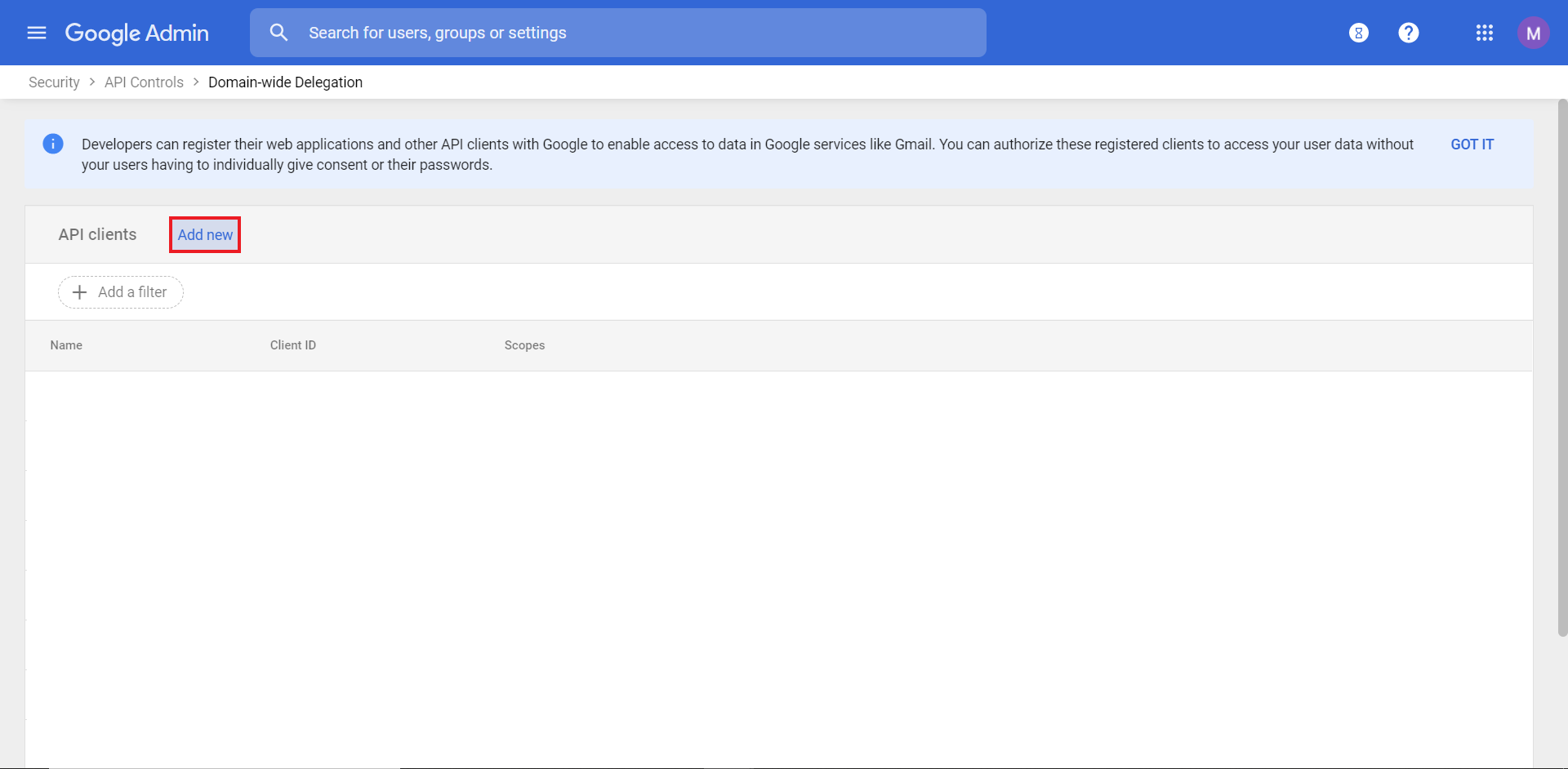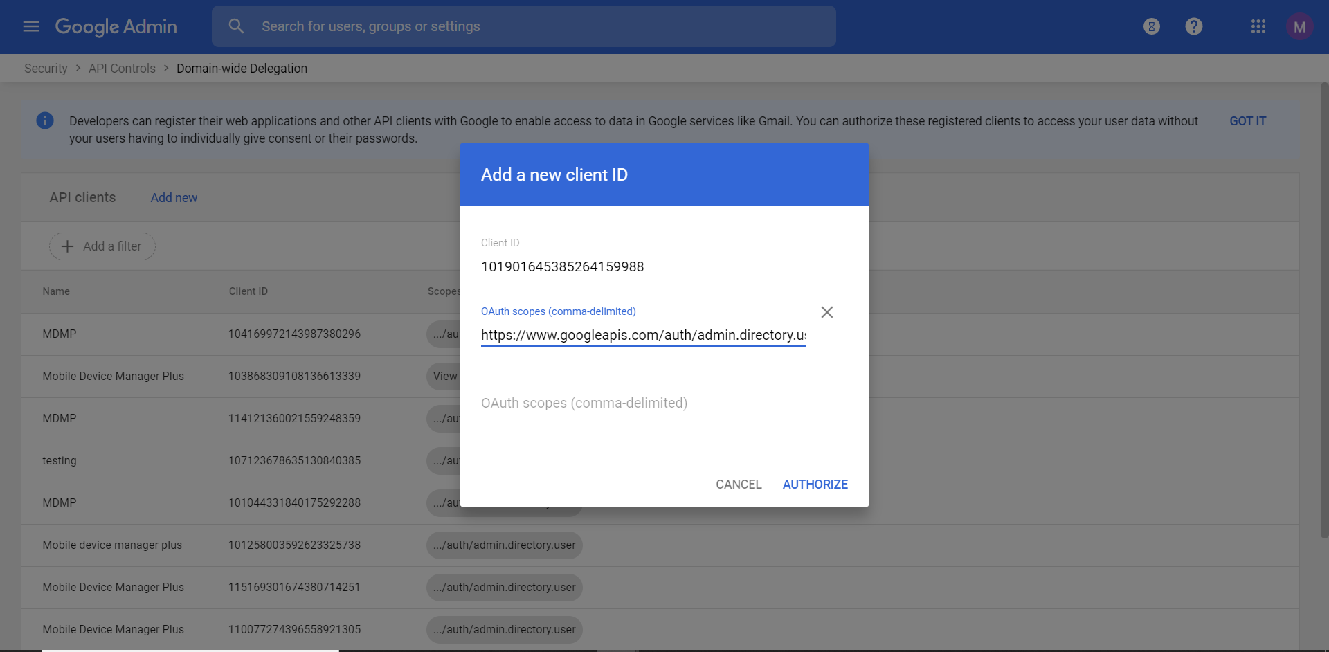 粘贴之前复制的唯一ID到客户端名称,并在OAuth范围下输入https://www.googleapis.com/auth/admin.directory.user。